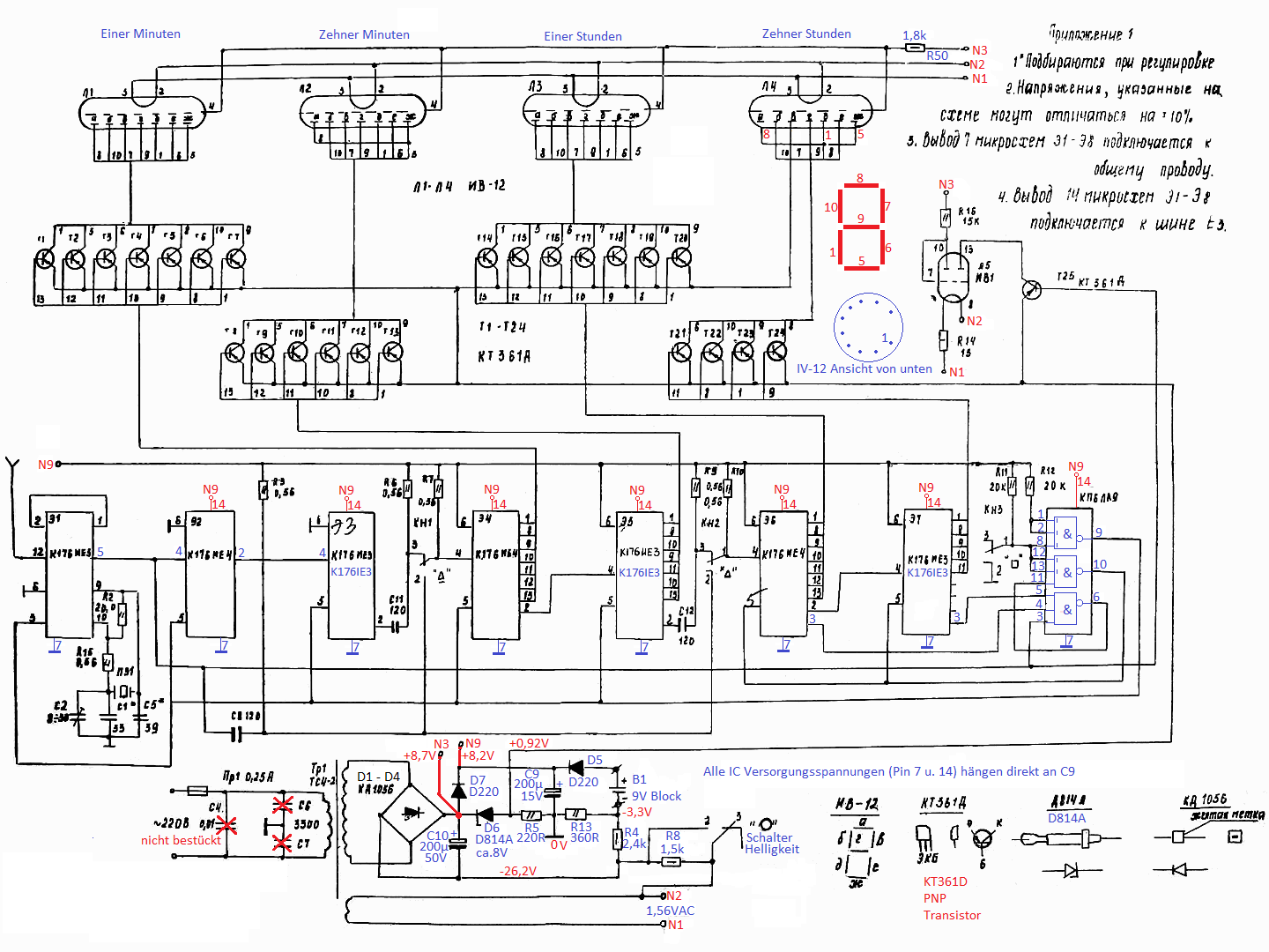 Hallo zusammen, ich habe eine alte russische Röhrenuhr die ich immer nur in den Abendstunden über eine Steckdosenleiste mit anderem Zeug zusammen betreibe. Die Puffer-9V Block Batterie ist aber nur für seltene Stromausfälle gedacht. Folglich ist sie relativ schnell leer (Etwa 0,45mA Entladestrom). Ich verwende zwar einen Akku aber den nach 4 Wochen jedes mal zum laden rauszupopeln ist schon nervig da dieser auch relativ stramm dort drinsitzt. Deshalb ist jetzt die Idee den Akku immer in den Abendstunden mit 1 oder 2mA automatisch in der Uhr nachzuladen. Ich hatte mal einen portablen CD-Spieler der konnte auch normale Standardakkuzellen innerhalb des Geräts nachladen. Zu meinem Glück ist die Uhr auf unten verlinkter Seite beschrieben. Auf der Seite gibt es auch einen Schaltplan, der leider schwer zu lesen ist, wegen der zu niedrigen Auflösung, der Handschrift und noch zusätzlich den kyrillischen Zeichen. Ich habe jetzt schon ein paar Stunden die Leiterbahen in der Uhr verfolgt um den Plan soweit wieder zu vervollständigen. Die Netzte habe ich jetzt mit N1, N2 usw. beschriftet. Dabei habe ich sogar noch einen Fehler entdeckt. Das Netz N3 (Gitterspannung der Röhren) ist direkt am Positivausgang des Brückengleichrichters angeschlossen und nicht an der Kathode von D7. Die Schaltung der Stromversorgung ist schon sehr verwirrend aufgebaut. Der Massebezugspunkt sind alle Minusanschlüse der MOS-ICs. Allerdings ist dieser Massebezug irgendwie total schwammig über Dioden und Widerständen gegenüber dem Minusanschluss des Hauptglättungsondensators C10 aufgehängt. Um es besser zu verstehen habe ich mir noch ein paar Spannungen eingezeichnet. Alle eingezeichneten Spannungen sind gegenüber dem Massebezug gemessen worden (Ohne Puffer-Batterie). Der Akku müsste doch geladen werden wenn ich einfach zu D5 einen normalen Widerstand parallel lege oder? Aber dieser merkwürdige Masseaufbau verwirrt total, deswegen wollte ich hier mal nachfragen bevor ich da was kaputt mache. Zur Beschreibung der Uhr: http://danyk.cz/stare_digi_hodiny_01_en.html Gruß Sven