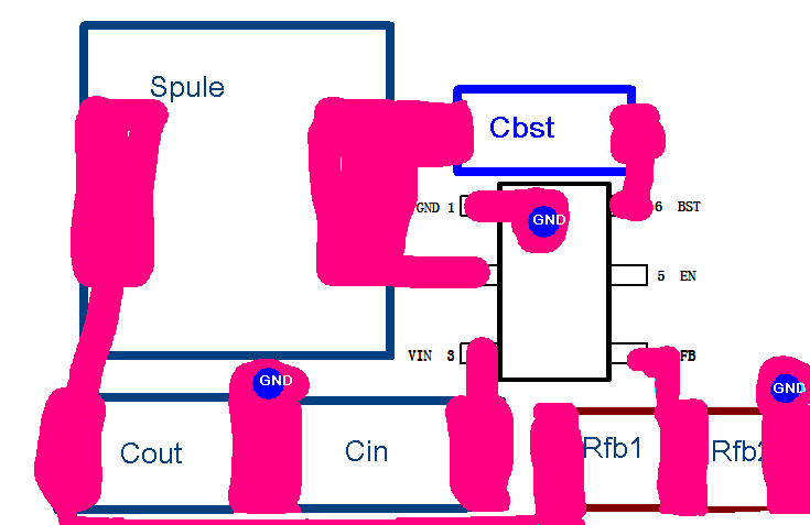 LausigerLötkolben schrieb: > Ich hab den 12MHz Crystal mit einem Oszi gemessen und seltsamerweise > erhalte ich an beiden 16pF Kondensatoren nur eine konstante 3.3V Spannung Die vielen Leiterbahnen unter dem Quarz hast du aber schon mit einer Isolierscheibe vom Quarzgehäuse getrennt? > Entsprechende Schaltpläne sind angehängt. Zeig auch mal ein Foto vom Aufbau. BTW: das Layout deines JW5033 Schaltreglers sieht überaus holprig und eigenartig aus. Den Ladestromkreis einen solchen kleinen MHz-Biests einmal komplett aussen um den ganzen Schaltregler herumzuführen ist schon etwas gewagt... Angehängt mal dein Layout mit den Farben der Stromkreise von dort: http://www.lothar-miller.de/s9y/categories/40-Layout-Schaltregler Wenn du diese Pfade verfolgst, dann siehst du, dass alles VIEL zu geräumig aufgebaut ist und zudem zwischendurch viel zu schamle Leiterbahnen eingefügt sind.