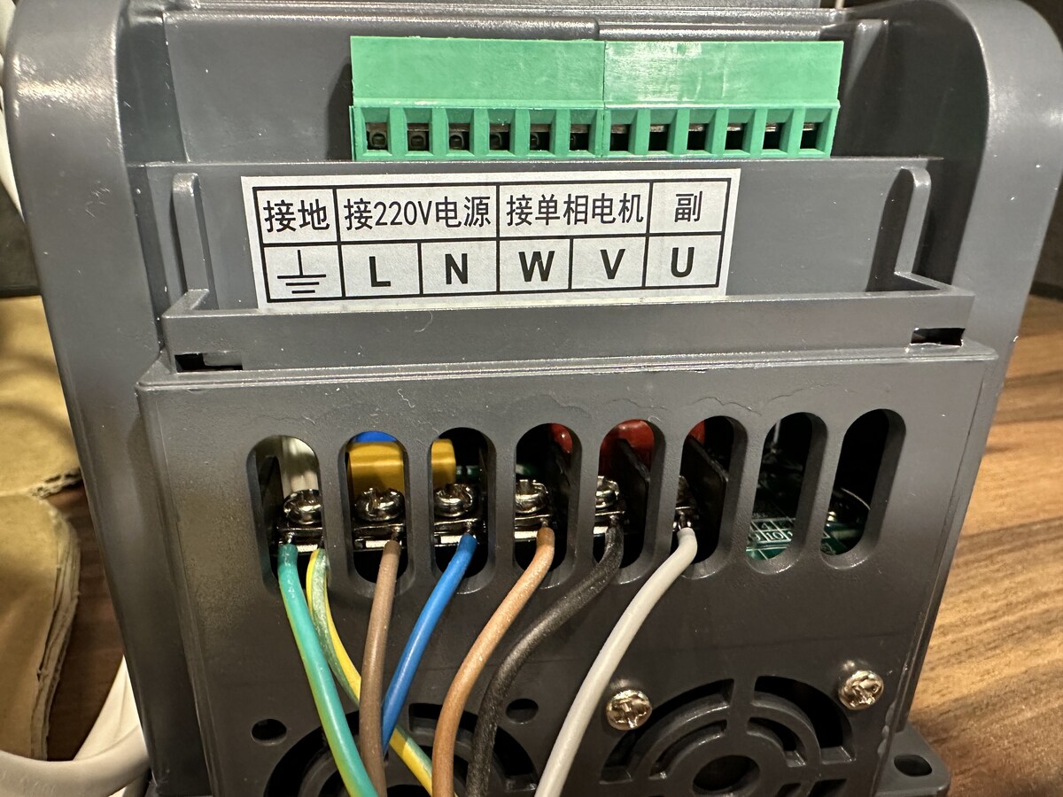Der Anschluss des FUs ist relativ einfach. Ein normaler FU hat ja die drei Anschlüsse (oft bezeichnet mit) U-V-W für dreiphasige Motoren. Hier bei diesem heißen die Anschlüsse auch U-V-W, wobei das W zusätzlich mit dem chinesischen Zeichen für „Vize“ gekennzeichnet ist. An diesen Anschluss W kommt die Hilfswicklung des Motors dran, die normalerweise ihren Phasenverschobenen Strom aus dem Betriebskondensator erhält. Die Hauptwicklung des Kondensatormotors wird an U und V angeschlossen. Der FU erzeugt jetzt die Phasenverschiebung, die sonst der Betriebskondensator erzeugt, und tut das ganze bei Variabler Spannung und Frequenz. Vorsicht, die Dinger sehen alle gleich aus. Entscheidend ist die Bezeichnung bzw. das er explizit als „geeignet für Kondensatormotoren“ angeboten wird. Ich konnte damals leider nicht alle Bilder hoch laden, suche es aber gern noch mal razs. Übrigens: Die scheinen die Eignung für Einphasenwechselstommotoren einfach weitestgehend softwaremäßig realisiert zu haben. Es gibt im Menü einen Parameter, den muss/kann man extra für diese Betriebsart einstellen bzw. er kommt so eingestellt daher. Ändert man den Parameter, so ist der FU als „gewöhnlicher“ FU zu verwenden - und der Einphasenwechselstrommotor läuft dann auch ganz ganz schlecht daran. Ich habs nur wenige 1,5 Sekunden getestet. Übrigens2: Angeblich kann mein FU bis 1,5 kW Motoren. Mein 1,1 kW Wechselstrommotor lief aber sehr schlecht an dem Ding. Er zog zu hohen Strom, es fehlte ihm an Drehmoment und er wurde sehr warm, bis ich dann abgebrochen und unter „geht nicht“ verbucht hab.