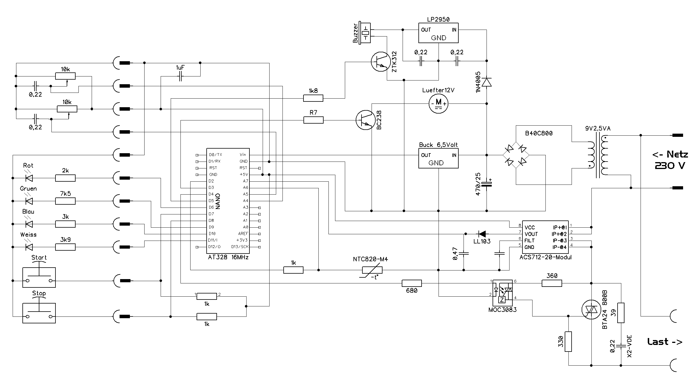 Mathias H. schrieb: > Darf eine Temperaturregelung bauen. In etwa so: Beitrag "Re: Leitungsschutzschalter kommt beim Abschalten" Die ursprüngliche Anwendung, einen Mikrowellenofen mit defektem (überbrücktem) Taktschalter zu steuern, hat sich inzwischen erledigt. Ich habe die Software verändert und takte damit ein Heizelement. Mit dem einen Drehpoti stelle ich die Laufzeit ein, mit dem anderen das Tastverhältnis 10..100%. Der Zyklus beträgt 10 oder 30 Sekunden, bei 10% ist der Ausgang also 1 bzw. 3 Sekunden an, schneller macht keinen Sinn. Da mein Gehäuse etwas knapp ist, überwache ich mit dem NTC die Kühlkörpertemperatur und werfe den Lüfter an, wird es dennoch mehr, wird abgeschaltet. Gemessen wurden 1,4V @ 9,5A = 13,3 Watt. Spielerei ist die blaue LED, die bei Lüfterbetrieb blinkt und mit zunehmender Temperatur schneller wird. Die primitive Stromüberwachung mit einer festen Schwelle sorgt für eine akustische Meldung, falls die Last fehlt. Das Ding würde auch SOS piepen, wenn der Triac einen Schluß bekommt, also Strom fließt, obwohl es aus sein sollte. Der selbstschwingende magnetische Pieper macht heftig viel Sauerei auf seiner Betriebsspannung und hat deshalb einen eigenen Regler bekommen. Ich musste etwas zaubern, der Versorgungstrafo mit nur 2,5VA hat sehr viel Spannungsüberhöhung und null Reserve.