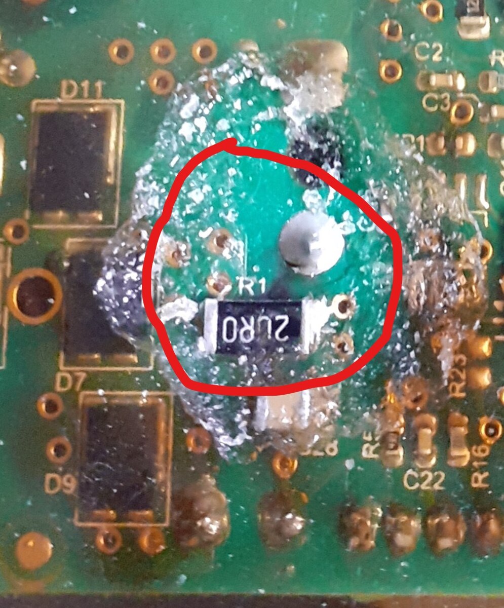 Sieht nach einem 20-Ohm-Widerstand aus, aber der ist ziemlich sicher nur "die Kopfschmerzen", das eigentliche Problem ist woanders.