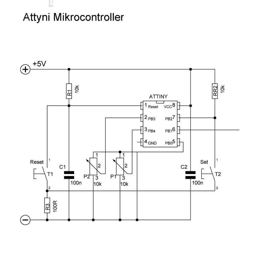 Bruno F. schrieb: > R 100 Ohm ist hinzugefügt. Den T2 kannst du ruhig direkt an GND angeschlossen lassen (da ist ja kein C) und die 100Ω würde ich auf der anderen Seite des Tasters anbringen. Elektrisch kein Unterschied, aber die Taster sind ja oft abgesetzt und dann braucht man nur drei Leitungen, GND, Reset, Start.