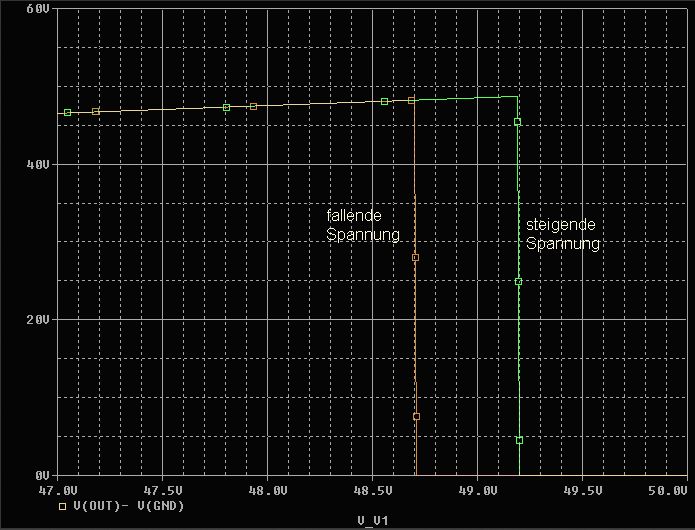 Hallo, ich weiß jetzt warum meine version der Schaltung eine Hysterese hat: Ich hatte der Sicherung am Eingang einen ohmschen Widerstand von 1Ω verpasst. dadurch kam es zu der Hysterese von 0.5V - als ich ihn auf 2Ω erhöht hatte, war Abschalten bei 49.7V, Einschalten weiterhin bei 48.7V, Hysterese also verdoppelt. Das bei einer Last von 100Ω. Bei 1kΩ Last, also 1/10 des Stromes, ist der Unterschied auch 10x kleiner, Hysterese also nur 0.1V, wobei die Wiedereinschaltspannung konstant bei 48.7V bleibt. Fazit: Es kommt auf die am Vorwiderstand (Sicherung) abfallende Spannung an, bei 1Ω und 48V/100Ω=0.48A eben 0.48V, bei 2Ω dann 0.96V. Nimmt man stattdessen eine Diode, also einen spannungsabhängigen Widerstand, ist der Enfluss der Stromstärke zwar immer noch da, aber wesentlich geringer. Eine Diode mit etwa 1V bei den Stromstärken die die dahintergeschaltete Anwendung typischerweise braucht lässt sich finden.