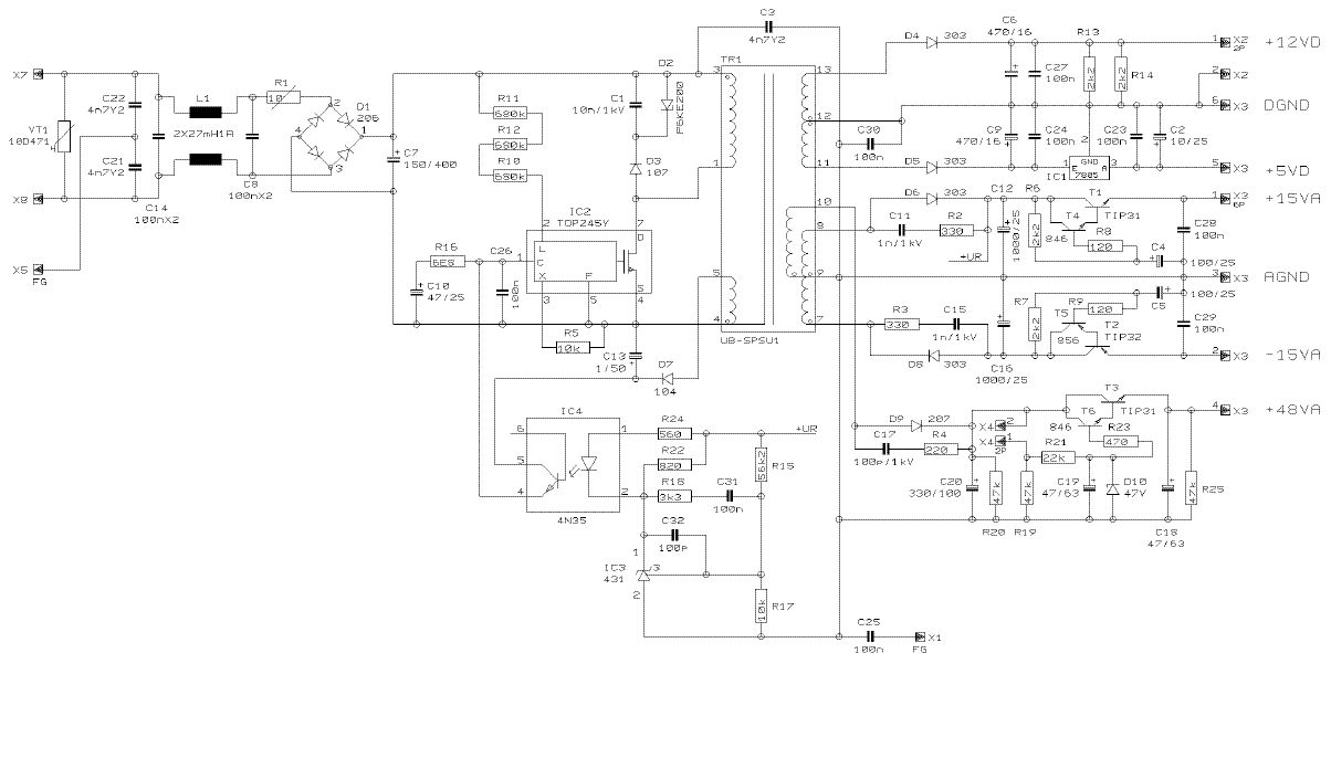Ja die Sicherung hat 1,6A träge. Zum Trafo: ja das ist das einzige Bauteil wo ich mir nicht sicher bin, dass er noch perfekt ist. Zumindest ist es das einzige Bauteil auf dem ein leichter Film ist als wenn Flüssigkeit ausgetreten wäre. (Mit großer Wahrscheinlichkeit ist das aber kein Elektrolyt das von anderen Bauteilen darauf gespritzt wäre). Wie misst man den einen Hochspannungstrafo? Habe im Hinterkopf, dass das gar nicht so einfach mit einem Multimeter geht. Kann ja vom Widerstand im richtigen Bereich sein und doch bei Spannung durchschlagen oder ? Bei einem Windungsschluß könnte der Trafo ja trotzdem noch einen Ohmschen Wert aufweisen halt nur den falschen? Andererseits kann ich mir nicht vorstellen, dass ein defekter Trafo noch die richtigen Spannungen am Ausgang erzielen kann. Habe jetzt zur Sicherheit die Anschlüsse des eingebauten TOP245YN nachverfolgt, ob ich durch das ausbohren nicht doch die innere Leiterbahnschicht zerstört habe, war aber nicht der Fall. Dabei habe ich festgestellt dass der Schaltplan nicht 100% mit meinem Netzteil zusammenpasst. R10 = auf meiner Platine R13, R5 = R6. Kommt also noch dieses Problem hinzu, solange man die Leiterbahnen noch verfolgen kann geht es ja noch ganz gut. Jetzt lacht mich bitte nicht aus, beim Optokoppler bin ich noch nicht drauf gekommen wo die +Ur (Ureferenz?) herkommt (wo wird die abgegriffen) und was am PIN 6 anliegt. Beim Starten hat man ja noch nicht die 5Volt die dieser braucht oder?