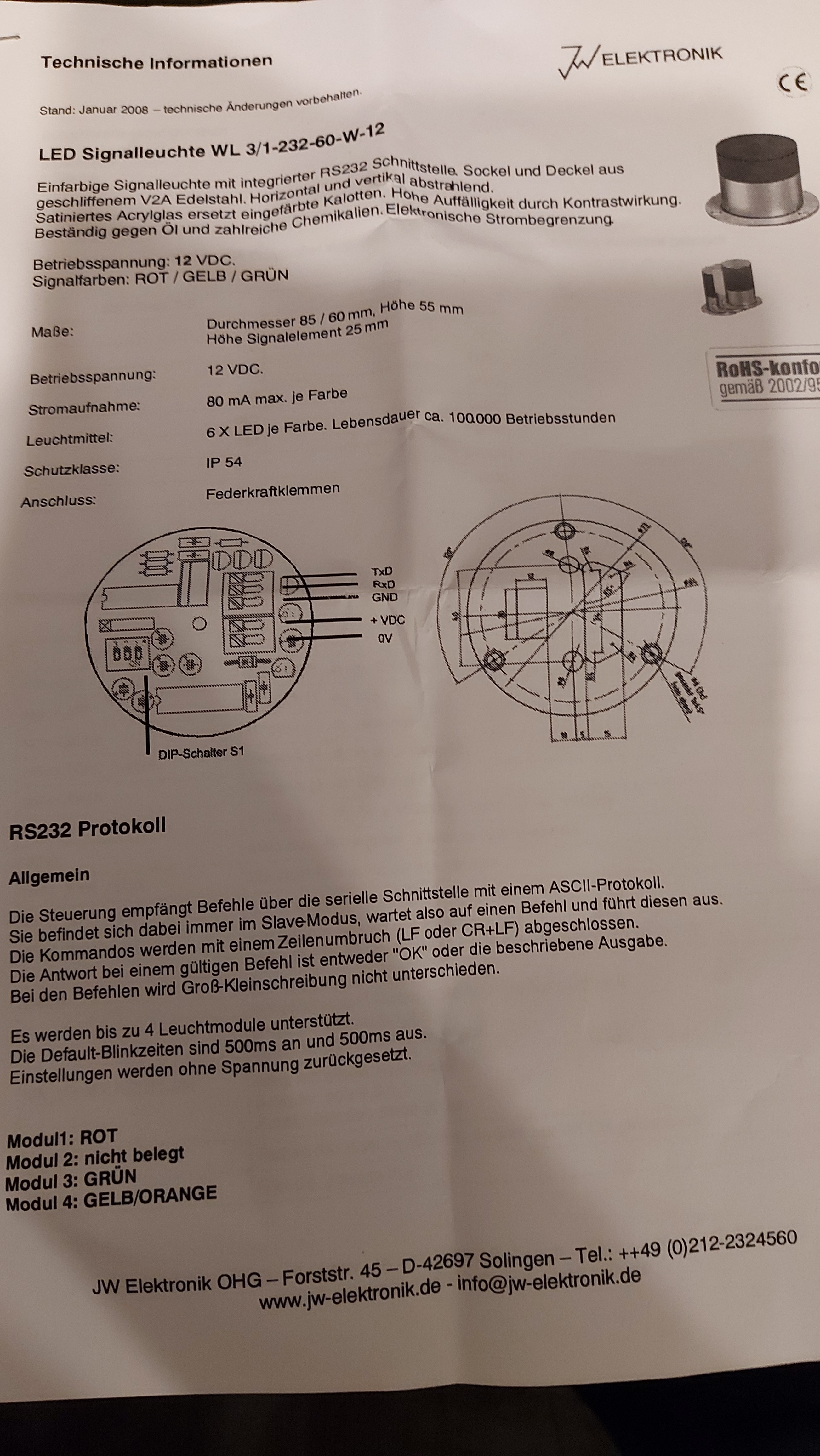 Hallo, hier noch was besonderes. Eine mehrfarbige LED Signalleuchte mit vielen verschiedenen Leucht- Blink und Blitzmodi. Über RS232 gesteuert. Versorgung 12V DC, IP65, Sattiniertes Acylglas. Sehr Hochwertig. Nie benutzt. Hersteller JW elektronik https://jw-elektronik.de/ Type: LED Signalleuchte WL 3/1-232-60-W-12 Details auf Katalogseite 21 ff. Mit optionalen Edelstahl Sockel mit Höhe ca. 35cm + Befestigungsmaterial etc. Zu Ansteuerung gibt es auch ein Tool vom Hersteller. Blinken Blizen timings einstellen etc.. Siehe Bild 9 Hier kostet sowas aus Platik schon 225€. https://www.esska.de/shop/Signallampe-mit-3-farbiger-LED-mit-RS-232-Datenschnittstelle--95998CFSA030-17390 Preis gebe ich diesmal nicht an. Kontakten! (Versand DHL/Post und Paypal, notfalls Überweisung ) Bei Interesse bitte PM mit Artikelangabe. Danke! MFG Roger