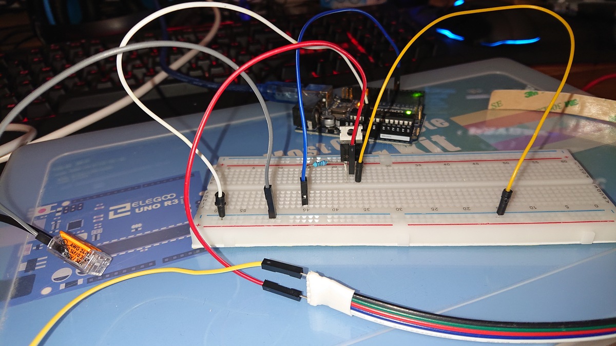 Hallo zusammen, ich habe mich schon ein Stück weit damit beschäftigt, wie man einzeln adressierbare LEDs mit einem Arduino steuert. Jetzt versuche ich, einen 24V-RGBW-Streifen per Arduino zu steuern und habe dafür eine recht simple Schaltung mit einem Mosfet (IRFZ44N) aufgebaut. Leider passiert so ziemlich genau überhaupt nichts. Soweit ich das erkennen kann, wird der Mosfet nicht durchgeschaltet, aber ich weiß leider nicht, wieso. Gesteuert wird der Mosfet über Pin-6 vom Arduino, ich habe das sowohl mit PWM (also z. B. analogWrite(6, 255)) als auch direkt mit digitalWrite(6, HIGH) probiert, hat beides nicht geklappt. Habe auch andere Pins probiert, mit und ohne PWM, hat alles nicht funktioniert. Einen Plan des Aufbaus habe ich angehängt. Sorry, falls die Symbolik nicht so ganz passen sollte, ich bin noch neu auf diesem Gebiet, ich hoffe, man erkennt den Aufbau trotzdem. Folgende potentielle Fehlerquellen kann ich ausschließen: - Das Netzteil - das liefert auf jeden Fall die 24V, das habe ich gemessen. - LED-Streifen - der ist auf jeden Fall auch nicht kaputt, wenn ich den Weiß-Anschluss direkt mit dem NT verbinde, leuchtet alles wunderbar - Arduino - der funktioniert ebenfalls einwandfrei und wenn ich den Streifen ohne den Mosfet dazwischen direkt mit dem Pin-6 vom Arduino verbinde, wird er auch wunderbar an- und ausgeschaltet. Habt ihr eine Idee, warum die Schaltung nicht läuft? Ich habe auch verschiedene Mosfets (allerdings alle vom gleichen Typ IRFZ44N) probiert, hat mit keinem geklappt. Wäre klasse, wenn ihr evtl. eine Idee habt, woran es liegen könnte. Ich habe auch noch ein Foto vom Aufbau angehängt, vielleicht hilft das ja beim Überblick verschaffen oder so. PS: Ich hatte die Schaltung auch schon mit 4 Mosfets aufgebaut (davon habe ich leider gerade keinen Plan gemacht). Der Aufbau war im Grunde identisch, außer, dass es noch drei weitere Mosfets gab, deren Gates mit den Pins 9, 10 und 11 am Arduino verbunden waren und deren Drains mit den restlichen Anschlüssen des LED-Streifens verbunden waren. Die Sources der Mosfets waren alle zusammen mit dem Common Ground verbunden (zusammen mit dem GND vom Arduino und vom Netzteil). In diesem Aufbau konnte ich dann den weißen Kanal steuern (also ich konnte den ersten Mosfet in der Reihe schalten), die drei anderen haben sich jedoch gar nicht gerührt und die LEDs blieben aus. Vielen Dank schonmal für's Lesen und hoffentlich helfen :)