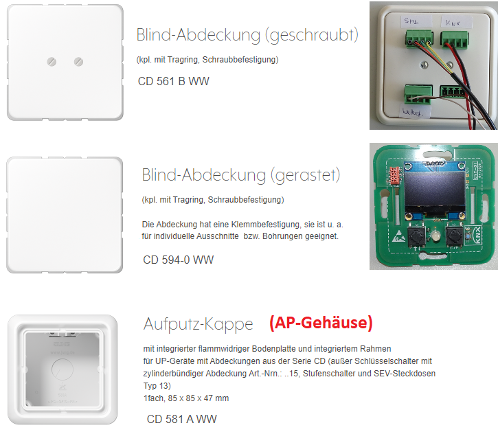 Hallo, ich habe bisher 2 Platinen realisiert, die zusammen mit Blindabdeckungen vom Jung-Schalterprogramm abgedeckt wurden. Diese kann man UP und mit einem AP-Gehäuse von Jung auch AP montieren. Die Blindabdeckung mit 2 Schrauben eignet sich sehr gut hierfür. Man muß nur im Bereich der Schrauben Platz haben für SMD-Muttern, wie sie z.B. Würth herstellt. Bei einer zweiten Platine habe ich für die 2 Schrauben bzw. SMD-Muttern keinen Platz, weil ein Display dort ist. Daher habe ich die Blindabdeckung zum Rasten vorgesehen. Hier werden links und rechts zwei Rastnasen in die Platine gesteckt. So richtig zufrieden bin ich damit nicht. Gibt es von anderen Herstellern von Schalterprogrammen Blindabdeckungen, die hier besser geeignet wären? Die Befestigung der Blindabdeckung mittels Magnet wäre nicht schlecht. Aber hier wird es wohl keine fertige Lösung geben. Muß man sich wohl selber basteln (Metall auf Platine, Magnet an der Blindabdeckung - oder umgekehrt). Gruß Martin