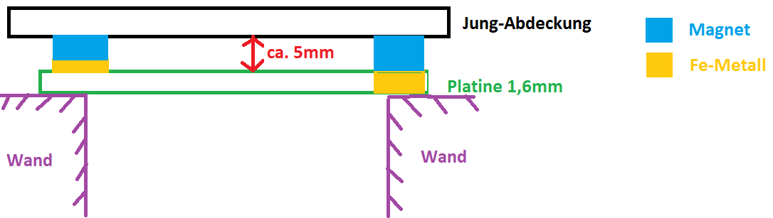 Nachdem bislang niemand eine Alternative genannt hat, habe ich mir bezüglich der Variante mit Magnet Gedanken gemacht. An 2 gegenüberliegenden Ecken ein Magnet / Fe-Blech, das die Abdeckung hält. An allen 4 Ecken wäre besser, aber nicht immer ist Platz auf der Platine. Anbei ein Bild, wie ich mir das vorstellen könnte. Magnet an die Jung-Abdeckung geklebt. Auf die Platine bzw. "in" die Platine ein FE-Metall. Maße maximal jeweils ca. 7x7 mm. Der Abstand zwischen Platine und Abdeckung beträgt 5 mm. Magnete habe ich z.B. hier gefunden (rund): https://www.magnetmax.de/Neodym-Scheibenmagnete:::117.html Rechteckige haben eher keine idealen Maße für meine Anwendung. Es gäbe auch selbstklebende, aber die sind leider etwas groß. https://www.magnetmax.de/Selbstklebende-Magnete:::135.html Ob es ein Händler gibt, wo diese in kleinerer Bauweise hat? Hält der Kleber dauerhaft an der Abdeckung? Da habe ich meine Zweifel. Wie stark sollte ein Magnet für diese Anwendung sein? Eine noch offene Frage ist, was nehme ich auf der Platinenseite. Prinzipiell könnte ich hier ja auch einen Magneten aufkleben. Aber es wäre technisch vermutlich sinnvoller, ein FE-Metallteil draufzulöten. Oder in eine Öffnung der Platine einlassen. Es muß aber auf alle Fälle auf der Oberseite durch Löten fixiert werden und darf unten nicht überstehen. Eine Art SMD-Kontaktfläche für Batterieanschlüsse oder so etwas wäre gut. So ähnlich wie das Teil im beigefügten Datenblatt, nur halt nicht aus Messing, sondern Fe-Blech. Eventuell eine SMD-Mutter von Würth? Was für geeignete Bauteile gäbe es noch?