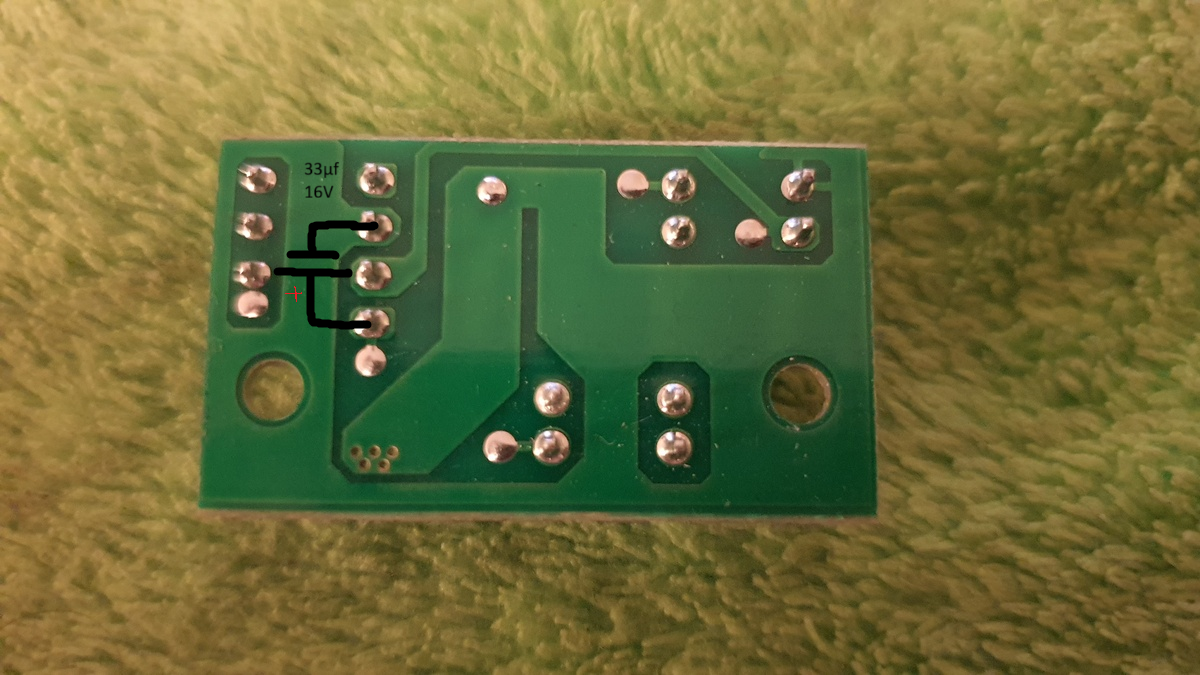 Bonjour à tous, un condensateur de 33µf 16V on suffit à faire le travail entre ces 2 bornes, bien respecter la polarité comme indiqué ainsi que la tension de 16V minimum pour le condo, avec ceci le mosfet uhzz66j8xm marqué M22 se retrouve bloqué, cordialement, Didier.