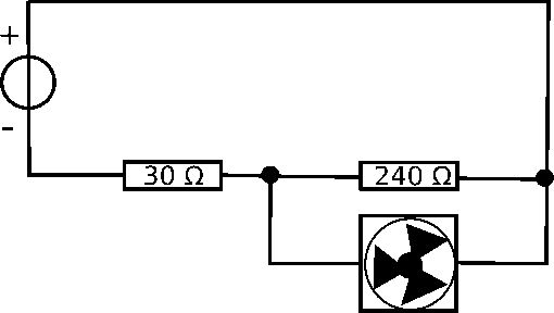 Da mag ich nicht ran'gehen. Ich hab ohnehin schon ungern das Netzteil aufgemacht, weil das nunmal gefährlich ist. Ich messe da bestimmt nicht im laufenden Betrieb dran rum. Netzteil sind nicht dafür gedacht überhaupt geöffnet zu werden, weil die Kondensatoren auch nach Abzug des Steckers geladen bleiben. Ich hab sehr darauf geachtet, bloß nichts anzufassen. Eine Temperaturregelung gibt es ganz bestimmt: Beim einschalten dreht der Lüfter nämlich immer hoch und ist im laufenden Betrieb dann leiser. düsenjet schrieb: > Der Deltalüfter hat lt. Angaben mehr Power und wird die auch liefern > können. Der hat mit 3,7 W mehr als doppelt soviel Watt wie der Originallüfter. Da hätte ich direkt die erste Frage: Wird der sich bei der Regelung genauso verhalten wie der alte? Außerdem scheint er mir mit 40 dB recht laut zu sein. Bei geringerer Drehzahl ist er sicher leiser. Ich hatte extra Sunon-Lüfter nachgeguckt, weil ich weiß, dass die in der Regel leise sind. Evert D. schrieb: > Warum nicht ein low drop 12V spannungsregler wie der LM2940 ? Die Idee hatte ich auch erst, bis mir auffiel, dass der Drop-Out genau in der Gegend zwischen 12 und 14 V liegt, also da, wo ich die Spannungsregelung brauche. Ein Spannungsteiler kennt Dropouts hingegen nicht und vernichtet die Spannung prozentual. Ein einfacher und eleganter Weg, wie ich finde. Ich würde gerne wissen, nach welchen Kriterien ein Ersatzlüfter überhaupt auszuwählen wäre. Wenn der jetzt weniger Watt hat: Kann der bei Vollast kaputt gehen? Die Energie kommt ja von einer STROMquelle. Das heißt, das Netzteil regelt die Spannung soweit hoch, bis der gewünschte Stromfluss erreicht ist. Ich habe für meine Rechnung einfach mal vorausgesetzt, dass bei 14 oder 15 V Schluss ist, weil der alte Lüfter nicht mehr vertrug. So kam ich beim alten Lüfter auf einen Innenwiderstand von 116,7 Ohm, beim neuen auf 240 Ohm. Deshalb ist der erste Widerstand im Spannungsteiler ebenfalls 240 Ohm.