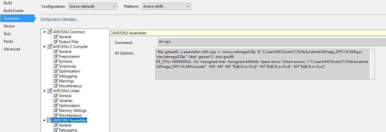 Glückspilz, das ich das hier überhaupt finde. Denn den originalen Thread überwache ich, den hier nicht. Anscheinend stimmen die Einstellungen im Projekt nicht. Schau dir die Einstellungen in den Bildern mal an. Beachte das ich nicht Atmel Studio, sondern Microchip Studio benutze (ist aber identisch) und das mein Studio in C:\xasm\ liegt - bei dir wahrscheinlich eher C:\Programme(X86)... Irgendwas fehlt bei dir noch, als hättest du nur eine unvollständige Installation. Nach dem Import sollten die Einstellungen nämlich so sein, wie ich sie poste. Denke dran, das richtige Ziel Device einzustellen, den ATMega 328 und die Taktfrequenz von 16000000 Hz.