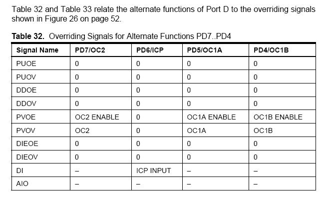 Hallo zusammen, bin mal wieder am Ende meiner Kräfte mit meinem Problem. Ich wollte heute eine Motorsteuerungsplatine an meinem ATMEGA32 betreiben. Alles läuft soweit wunderbar, ausser das mir der Port PD7, den ich als Ausgang definiert habe nur ca. 2.5V anzeigt und nicht 5.6V wie der Port PD3. Die PMW hab ich auf OCR1A und OCR1B angelegt und funktioniert auch wunderbar. PD2 und PD3 hab ich als Schalter für den einen Motor PD6 und PD7 für den anderen. Bei PD2 und 3 funktioniert es wunderbar. 0V und 5.6V wen ich die Pin ändere gerade anders. 5.6V und 0V. Motor dreht anders. Wenn ich bei PD7 messe hab ich 0V und 2.5V. Wenn ich die Pinbelegung ändere im Programm hab ich 4.4V und 2.5V. Wo kann mein Problem liegen? Wäre froh um jede hilfe. Mit freundlichen Grüssen Manuel Miklo