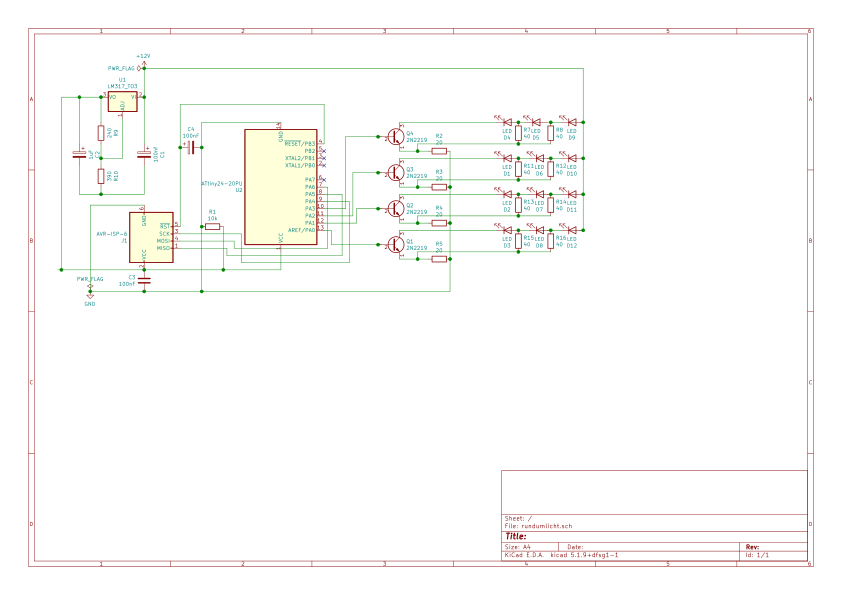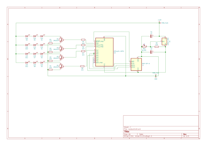 Mache das lieber mit sehr viel mehr LEDs, wenn es es nach "Rundum" aussehen soll. Da hast du ein Beispiel mit 12 LEDs an einem kleineren ATtiny, ohne für dich unverständliche Transistoren: http://stefanfrings.de/knightrider/index.html