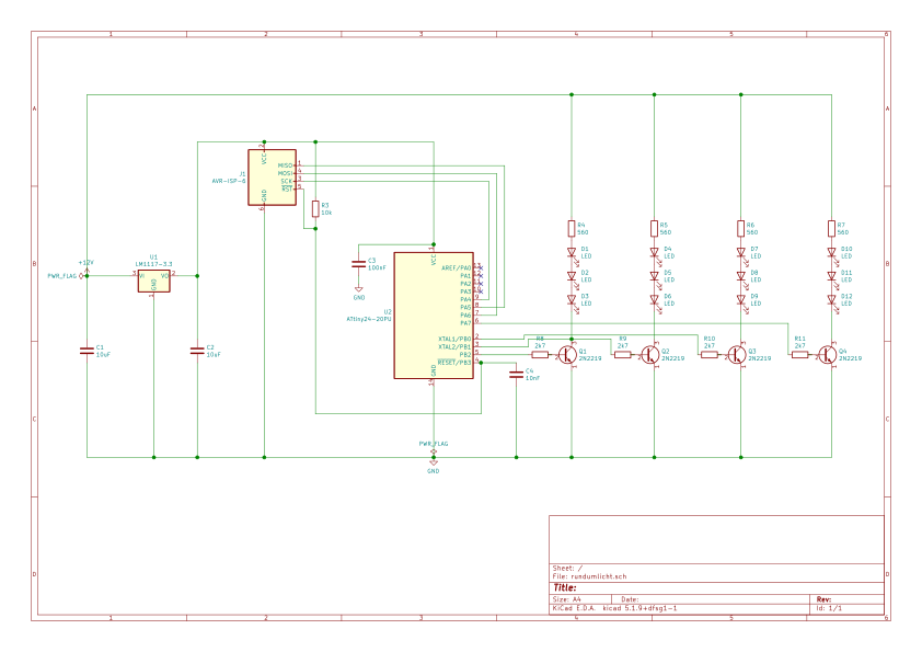 Der µC liefert 5V Signale. An der B-E Strecke der Transistoren fallen 0,7V ab. Bleiben noch 4,3V für die LEDs übrig. Preisfrage: Wie viel Volt brauchen drei LEDs in Reihe? Lies Kapitel 2.2 und 3.4 http://stefanfrings.de/mikrocontroller_buch/Einstieg%20in%20die%20Elektronik%20mit%20Mikrocontrollern%20-%20Band%202.pdf In deiner "korrigierten" Schaltung fehlen die Kondensatoren am Spannungsregler. Halte dich an die Vorgaben aus dem Datenblatt! Am Mikrocontroller fehlt der Abblock-Kondensator (typisch 100nF) and VCC und GND.