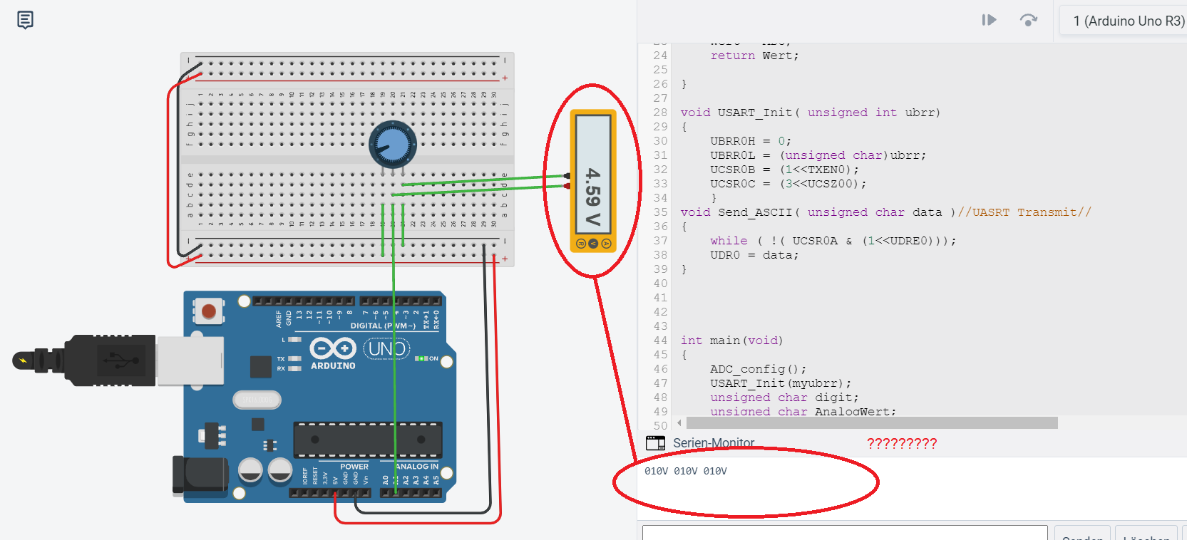 Guten Tag, ich bin hier newbie habe Problem mit der Aufgabe, wobei man die analoge Spannung eines Potentiometers mit Hilfe von Atmega328p ablesen kann mit der Genauigkeit 2 Stelle nach dem Komma. Ich versuchte die Eingangspannung über digitale Werte von ADC zu berechnen. Ich habe mit TinkerCAD simuliert aber die Spannung, die abgelesen wird, stimmt mit den Messwerten am Multimeter gar nicht. Vllt liegt irgendewo Fehler. Ich bedanke mich für jede Hilfe :D. Ich wünsche euch einen schönen guten Tag noch !! Im Anhang findet man das Bild der Simulation zur Erläuterung und den Code.
