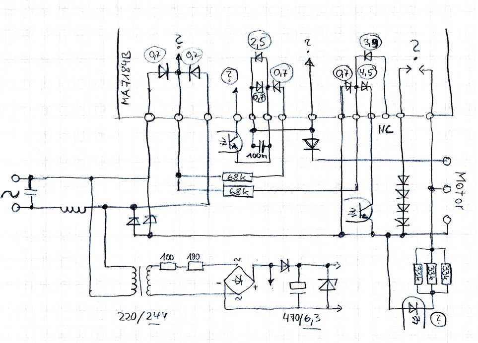 Danke nochmals an alle für gute Gedanken und Hinweise. Ich muss die gute Frau doch missverstanden haben: Sie habe die Maschine als quasi unbenutzt für einen schmalen Taler aus einer Erbschaft erstanden (sie war der Meinung, dass es eine viel neuere Maschine gewesen sein muss). Hatte bereits einige Tage damit experimentiert und die Maschine sei einwandfrei gelaufen, auch weil sie sich nach Anleitung bereits um die nötigen Schmierpunkte gekümmert hatte. Mitten im regulären Betrieb machte es Knall. Spricht eher weniger für einen defekten Motor. Ich habe nochmal ein näheres Bild hochgeladen: Es gibt noch einen zweiten Defekt. Ich werde nicht schlau daraus, was sich hinter diesen vergleichsweise dicken Buckeln verbirgt, Tantal-Elkos? mit den üblichen Folgen? Das zweite Bild ist der Versuch einer Schaltungsrekonstruktion. Die Bauteile im oberen Teil (dem Modul) sind die, wie sie mein Chinamann-Arduino-Bauteiletester ermittelt haben will, mit Angabe der Diodenflussspannungen, ich habe da erst mal bewusst nichts hineininterpretiert. Für mich fehlen offenbar Verbindungen. Plan und Foto sind gleich orientiert. Nur zum Dazulernen: Was könnte sich im Modul tatsächlich befinden? Links ist klar: zwei Dioden zusammen mit zwei "Perlen" ist ein Vollweggleichrichter, die dritte Perle liegt in Reihe zur Motor. Die halb eingekreisten Bauteile sind die entsprechenden Hälften der Optokoppler. Falls noch jemand erhellendes beizusteuern hätte, bitte her damit! Sonst R.I.P. - auch die Dame hat ihren Frieden mit der Situation bereits gemacht.