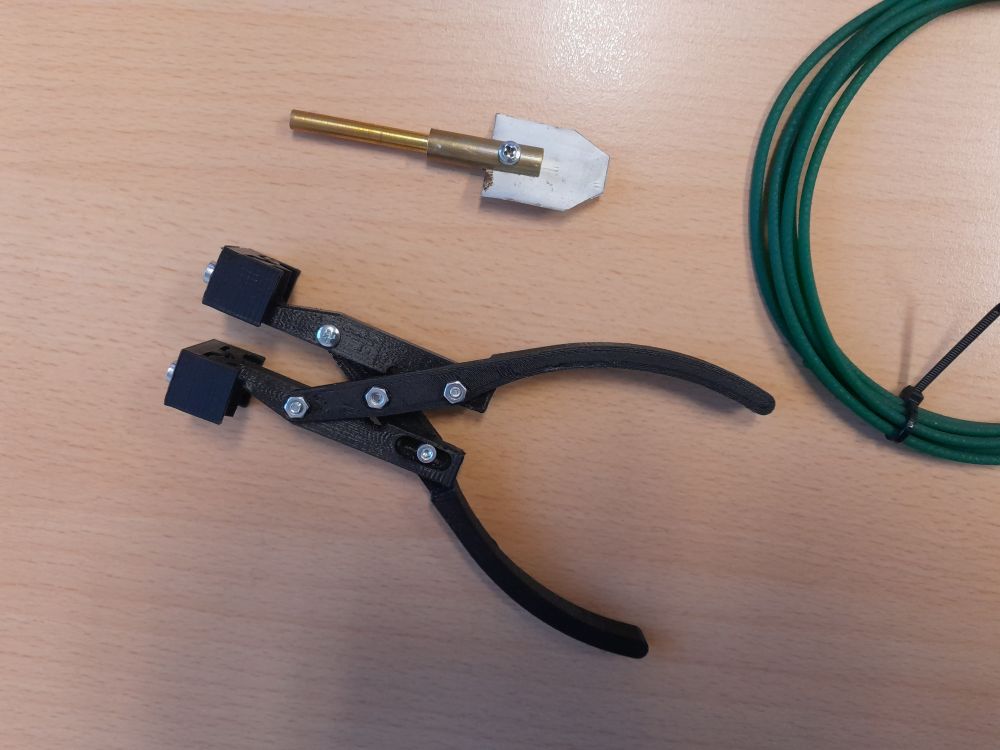 > Für die Führungszange gibt es ein passendes Modell bei Thingiverse. > Ich find's grade nicht wieder. Adjustable Polyurethane PU Round Belt Welding Clamp https://www.thingiverse.com/thing:3417119
