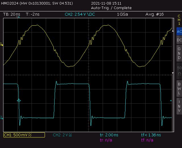 Die Gedanken von jo sind richtig, allerdings beschreibt m.n. auch richtig, warum es fast keinen Grund geben sollte, es anders als mit dem einen Widerstand zu machen. Fast: Der Widerstand sorgt für eine etwas höhere Miller-Kapazität - und die machte sich nach meinen Erkenntnissen ja bemerkbar. m.n. schrieb: > Könntest Du vielleicht beide Signale gleichzeitig anzeigen? Das ist eine Herausforderung, wenn beide Massen und die Tastspitzen direkt angeschlossen werden müssen. Geht aber. Dieses Mal mit höherer Bandbreite oszillografiert. Zu meiner Überraschung sehen die Signale völlig(!) anders aus. Der Rechteck ist praktisch perfekt, der Millereffekt ist auch andeutungweise nicht zu sehen. Die Verrundung des Signals auch nicht. Was da los los? Wer misst, misst Mist??? Dass die Miller-Kapazität durchaus Einfluss auf das Quellsignal hat, ist zu erkennen. Die Quelle scheint mir ein Parallel-Schwingkreis im Kollektor oder Drain eines Transistors zu sein. Dass die Zacken im Kanal 1 nicht durch Übersprechen der Kanäle stammt, ließ sich leicht nachweisen, indem ich die Tastspitze von Kanal 1 zusammen mit seiner Masse auf die OCXO-Masse gelegt habe, und gar kein Übersprechen mehr sichtbar war. Mein nächster Plan wäre wohl eine 'LVC1GX04 gewesen. Das ist ein Oszillator-IC, bestehend aus einem ungebufferten Inverter vor einem gebufferten Inverter in Reihe geschaltet. Nachteil: Ungünstiges Layout, Vorteil: Die habe ich hier. Aber so sieht es eigentlich jetzt schon perfekt aus. Und den Tastkopf am anderen Oszi muss ich mal prüfen...