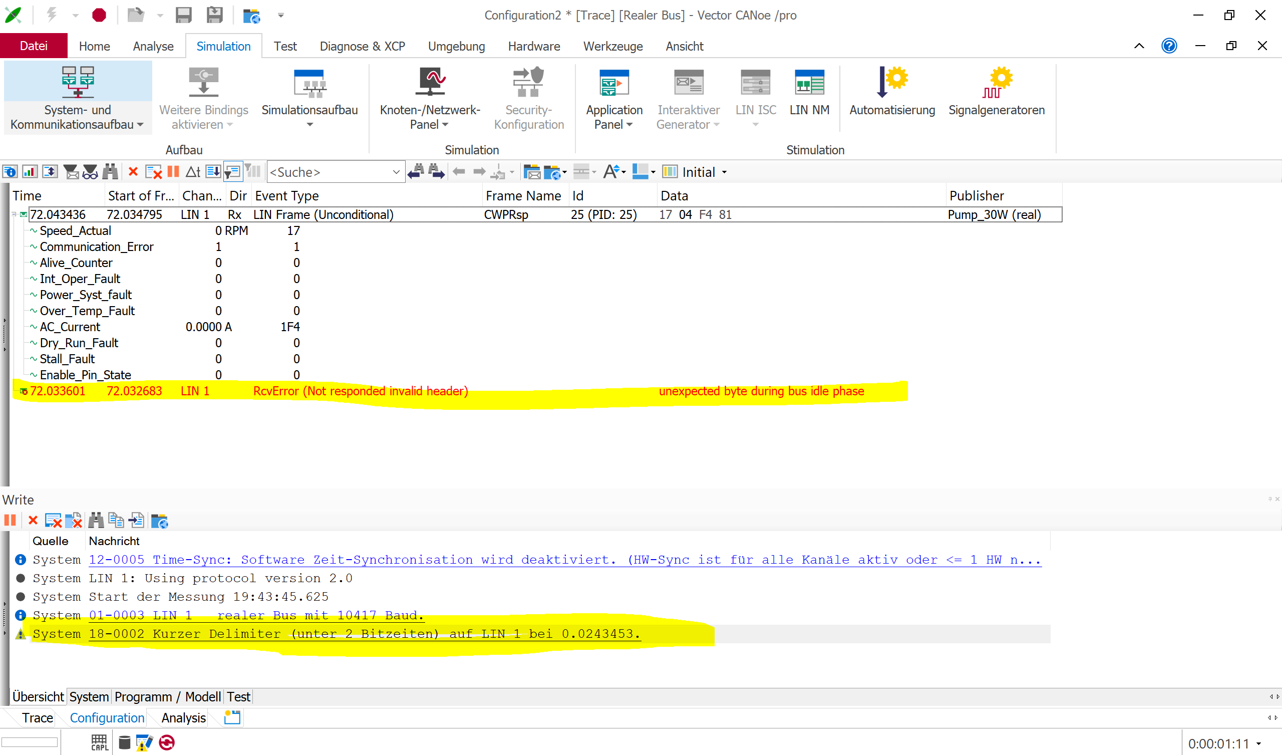 Hallo Forum, wir versuchen gerade eine Pumpe per LIN anzusteuern. Der Master ist ein Sensorknoten mit STM32F103C8T6, die Slave eine Pumpe von Bühler die nur über LIN (J2602) kommunizieren kann. Mit der CANoe Simulation mit Hilfe der .ldf-Datei hat es problemlos geklappt nachdem die Baudrate richtig eingestellt wurde. Unser Sensorknoten wirft aber immer diesen "RcvError (Not responded invalid header), unexpected byte during bus idle phase"-Fehler. Dazu weist CANoe auf einen zu kurzen Delimiter hin. Wir vermuten zudem dass es an der Time Schedule liegen könnte. Kennt jemand vielleicht dieses Problem? Wir würden uns über jede Art der Hilfe freuen. LG