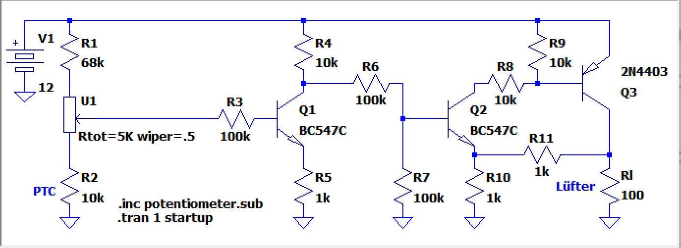 Stimmt, die Schaltung ist ein Zweipunktregler. Kontinuierliche Regelung geht auch, braucht aber einen Kühlkörper zum Leistung verheizen. Q3 muß dann jedenfalls was größeres werden, TO220 mit KK.