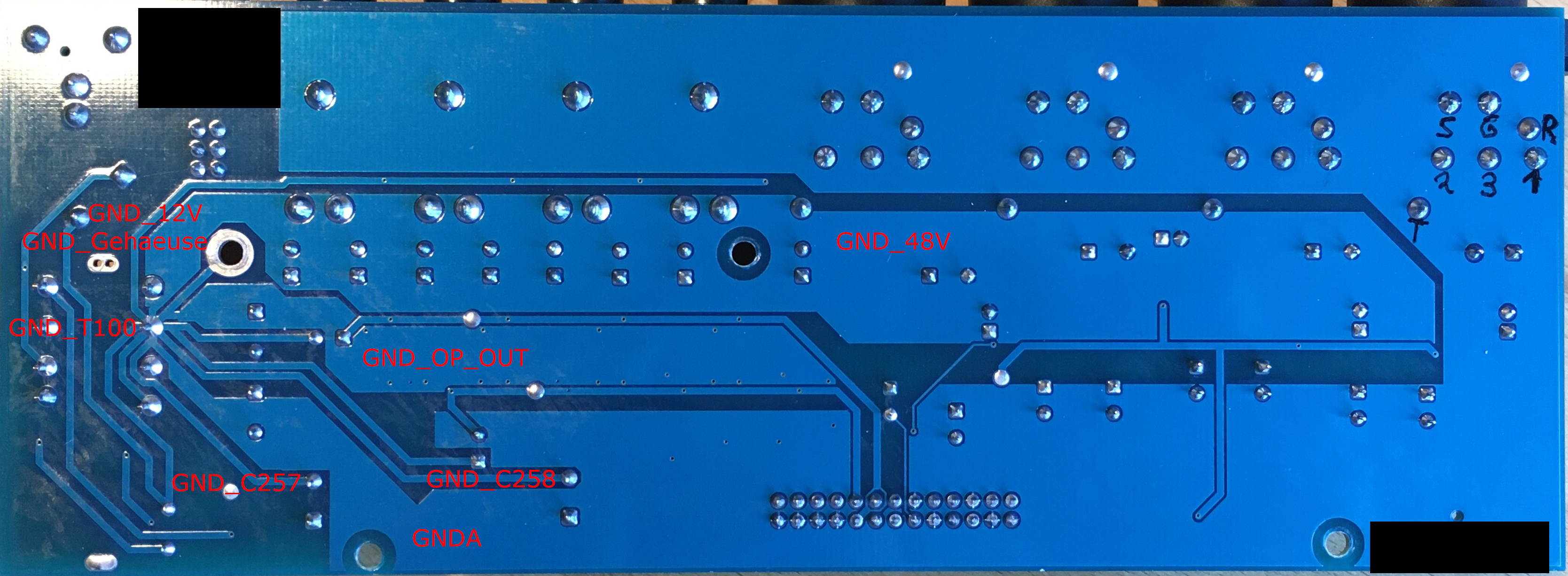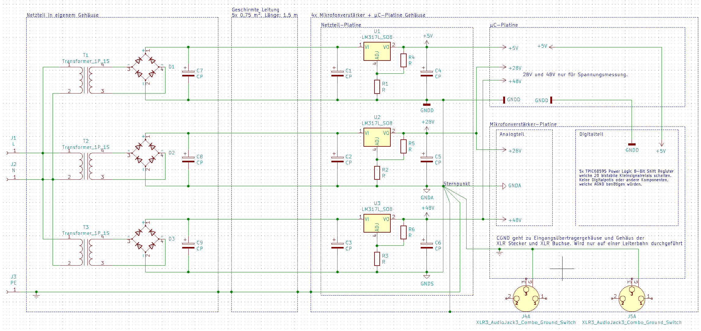 5-pin-Stecker: 5V, GNDD, +28, +48, GNDA. Schirm nur an den Sternpunkt, der sitzt im Gerät, nicht im Netzteil. GNDA für 28V und 48V geht. Für die Schönheit: T2 und T3 durch einen mit 2 Sekundärwicklungen ersetzen.