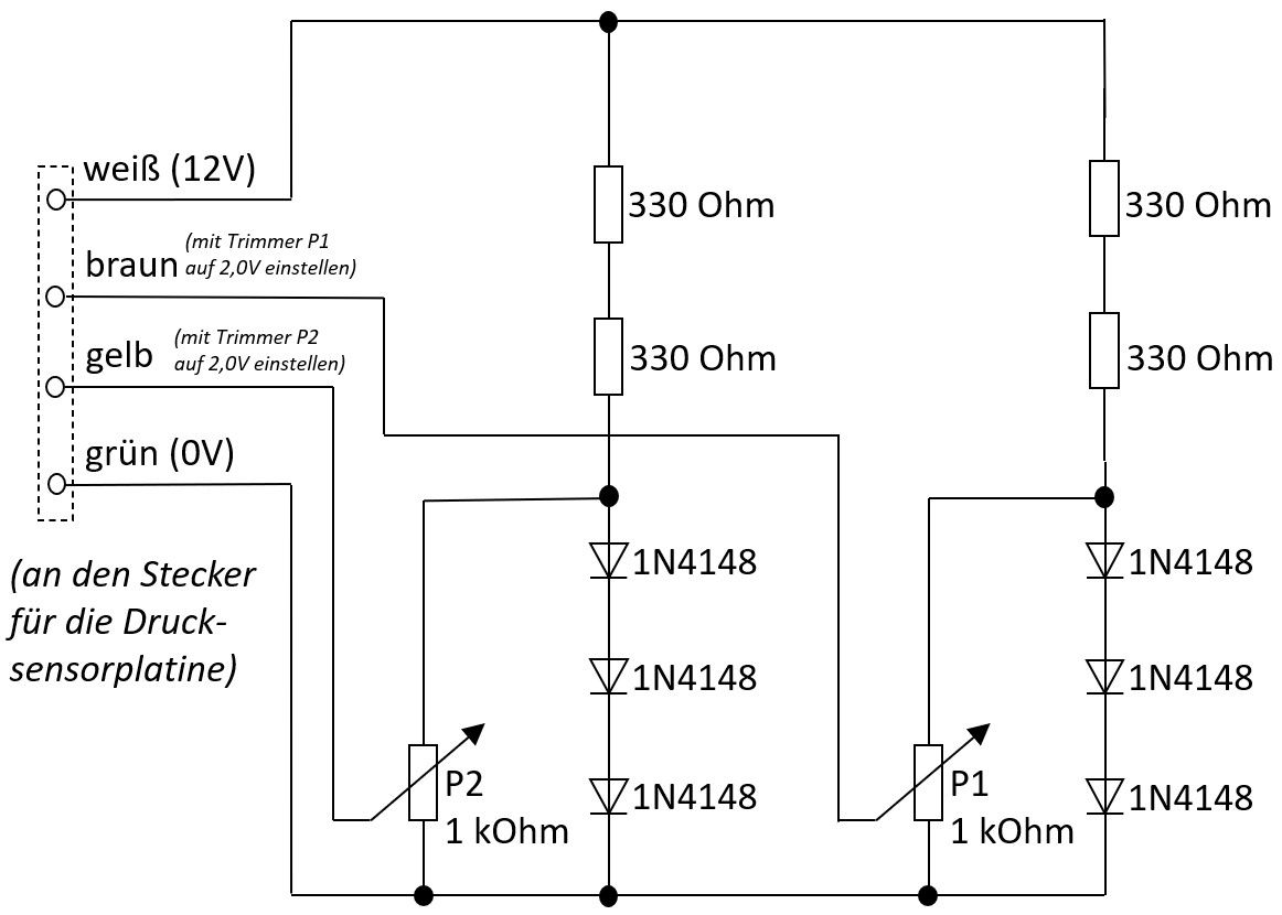 Falls die Belüftungsanlage trotz Filterreinigung und fehlerfreier Lüfter weiterhin Störungen meldet, sollte die Funktion der Drucksensorplatine bei der Fehlersuche in Betracht gezogen werden. Die Drucksensorplatine wird mit 12V betrieben. Über die beiden Differenzdrucksensoren werden Steuersignale an den Platinenanschlüssen S1 und S2 bereit gestellt. Im Ruhezustand sollten dies jeweils 2,0V sein. Mit einer ganz einfachen Schaltung können die 2,0V bereit gestellt werden. Diese Schaltung wird einfach auf den Stecker, der zur Drucksensorplatine führt, gesteckt (siehe: https://www.mikrocontroller.net/attachment/536360/Bild1_Testschaltung_20211115_152424.jpg). Bauteile-Liste für die Testschaltung (siehe Schaltbild): 1. Widerstände (4 x): 330 Ohm (es können auch 2x 680 Ohm sein, dann aber min. 1/4Watt!) 2. Widerstandstrimmer (2 x): 1 kOhm 3. Dioden (6 x): 1N4148 (Universaldiode) 4. Etwas Klingeldraht, Isolier-Schläuche Diese Schaltung stellt lediglich die erforderlichen 2,0V für die Hauptplatine in der Lüftungsanlage zur Verfügung, d.h. die Drucksensoren werden simuliert, wennauch für den statischen Fall (keine Druckänderungen). Leider hat dies bei meiner Anlage weiterhin zu Fehlermeldungen geführt. Hat jemand ähnliche Tests durchgeführt und kann hier seine Erfahrungen mitteilen?