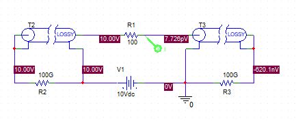 Simulation versagt völlig, weil in den Programmen die Lichtgeschwindigkeit fehlt. Es wird offenbar lediglich mit Verzögerungszeiten gerechnet. Simuliert habe ich eine 10V-DC-Quelle, einen 100R-Widerstand, und auf beiden Seiten je eine verlustbehaftete Leitung mit Daten wie ein normales 50R-Kabel, aber mit R=0 und Länge 150000000m (also nur 1 Lichtsekunde hin und zurück), an den Enden abgeschlossen. Da PSpice, musste von da noch je ein 100G-Widerstand zur Quelle. Raus kommt Folgendens: Beim Start I=100mA, fällt in 100ns auf 1.5mA, dann weiter wie im Bild. Bei 2s passiert nix Außergewöhnliches, I=99.66542mA. Ich kann mir nicht vorstellen, dass das so ablaufen würde. Naja, Simulationen sind ja normalerweise nicht für Lichtsekunden oder Lichtjahre große Schaltungen ausgelegt.
