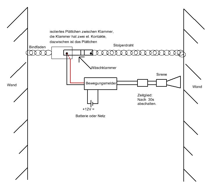 Guten Tag, nachdem in meinem Keller eingebrochen wurde und wertvolle Gegenstände weggekommen sind, überlege ich, was ich unternehmen könnte, damit das nicht wieder passiert. Ich dachte mir, ich verlege so eine Art Stolperdraht. Auf der einen Seite an einer Schnur befestigt ist eine Wäscheklammer mit elektrischen Kontakten, dazwischen sitzt ein Isolierplättchen. Das Plättchen ist dann ebenfalls an einer Schnur festgebunden, S. Skizze. Wenn der Einbrecher gegen den Draht kommt, flutscht das Plättchen raus, Kontakt ist da, der Bewegungsmelder wird eingeschaltet und die Sirene macht für 30 Sekunden lang Krach. Danach ist der Alarm aus, aber der Bewegungsmelder ist scharf gestellt. Wenn der Einbrecher zurückkommt, gibt es sofort wieder Alarm. Ich finde die Abschaltung muß sein wegen der Nachbarn. Die Sirene würde ich dann etwas verstecken, ebenso wie den Bewegungsmelder. Den Sensor kann man ausbauen, an ein Kabel löten und so deponieren, daß man ihn nicht gleich sieht. Was spricht dagegen, das so zu machen? Gibt es das schon? Welche Teile von Conrad wären am besten dafür geeignet.? Hat jemand Zeit und entwirft die entspechende Schaltung dafür, eventuell mit Stückliste? Das wäre schön. Ich hätte das Vorhaben gern möglichst schnell umgesetzt. Für jede Hilfe dafür wäre ich dankbar. L.G.