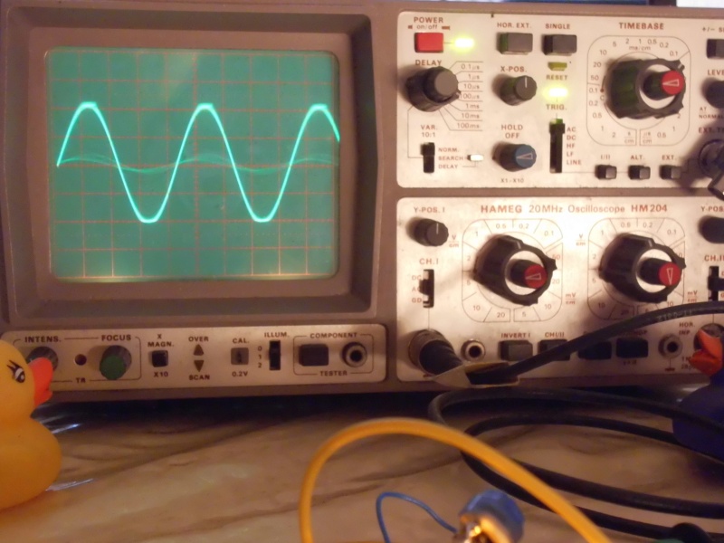 Hallo nochmals, anbei noch das Schaltbild des 60 kHZ-Überlagerungs-Empfängers für MSF und ein Oszilloskopbild des 2,4 kHz-Ausgangssignals im oberen Strahl und der Mischer-Kollektor im unteren Strahl. Eingestellt waren 50 mV/cm und 50µs/cm. Im dritten Bild unkalibrierte Zeitbasis. Den TEK 502 Zweistrahler habe ich anlässlich der Feiertage nach mehr als 10 Jahren Ruhestand endlich wieder vorgeheizt und dann erst eingeschaltet. Besonders im Winter machen diese Geräte Freude. Es ist größer schwerer und deutlich lauter als das Rigol 1054, stört den Empfang überhaupt nicht und pfeift innen drin mit diesen 2,4 kHz, deren Unterbrechungen man im Sekundentakt hören kann. Durch die lange Belichtungszeit verschwimmt das Strahlenbündel der oberen Bildhälfte zu einem gebogenen Band, das alle vorkommenden Amplituden zeigt. Das Signal vom Mischer ist eigentlich nur wildes Rauschen. Die Ferritantenne liegt am etwa 20cm langen Draht links daneben, damit sie nicht den Oszillator aufnimmt. Maus schrieb: > Gratuliere! Danke. Die Abhandlung von Gustav werde ich mir baldmöglichst ansehen. mit freundlichem Gruß