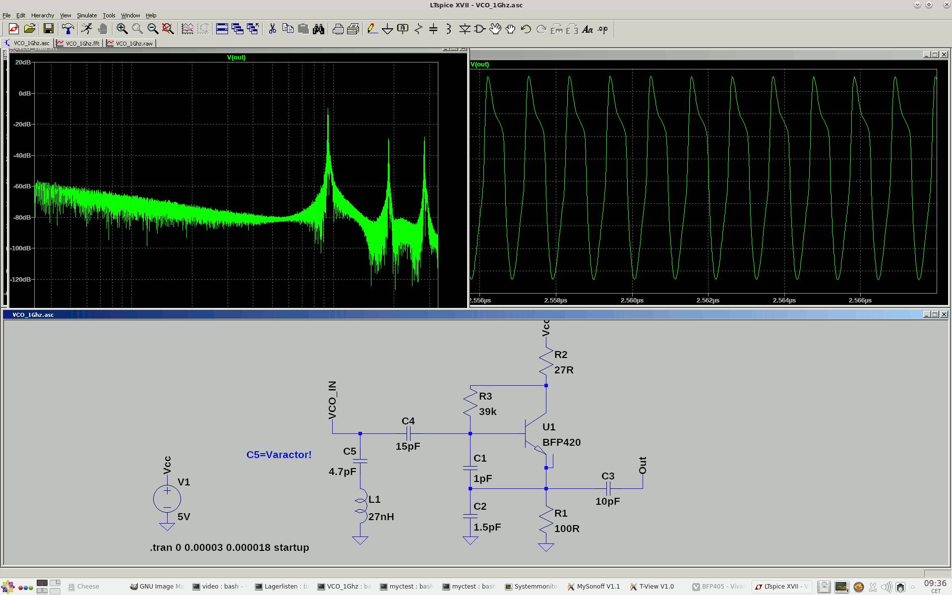 > Macht der wirklich eine 1048576 ( 2 exp20 ) FFT? Das kann ich kaum > glauben. Beim RTB2004 sind es 128k: https://www.batronix.com/versand/oszilloskope/Rohde-Schwarz-RTB2004.html Zitat: Dank der ausgezeichneten FFT-Fähigkeiten der R&S® RTB2004 Oszilloskope können Signale mit bis zu 128k Punkten analysiert werden. Ich denke aber das dies Absicht ist. Beim HMO2022 war es so das die Hardware Grenzen gesetzt hat und sich die Software bemueht hat alles rauszuholen was ging. Beim RTB2004 ist die Hardware erheblich leistungfaehiger und man hat gelegentlich das Gefuehl das die nicht alles rausholen wollen weil sonst wesentlich weniger Leute einen Grund haetten sich ein RTM zu kaufen. So gross sind die Unterschiede naemlich nicht. Aber ja, ich denke nicht das so ein Teil in jeder Beziehung einen Spektrumanalyzer ersetzen kann, das aendert aber nichts daran das der Level auf dem die Kisten das koennen schon relativ cool ist und dazu fuehrt das du im normalen Alltag haeufiger auf den FFT-Knopf drueckst. Man will das haben. Nur der Bodeplotter ist noch cooler. .-) > Allerdings würde eine kleine globale Massefläche unter der > Schaltung die Stabilität und Reproduzierbarkeit verbessern. Wenn du genau auf das Bild der Eingangsmail schaust dann wuerdest du sehen das ich die Oberseite des Lochraster ein Stückkupferfolie geklebt habe. Das mache ich bei vielen Aufbauten so weil man dann auch GND einfach so bekommen kann indem man ein Stueck Draht zum "2.Layer" durchpiekst. Wenn ihr uebrigens SEHR genau auf das zugegeben etwas schlechte Bild vom Aufbau geschaut haettet dann waere euch aufgefallen das ich da einen echt peinlichen Aufbaufehle gemacht hab. Da ist ein C falsch angeschlossen. Erstaunlich das es ueberhaubt funktioniert habe. Mittlerweile funktioniert die Schaltung ganz gut. Wer sich im uebrigen ein bisschen fuer die Hintergruende interessiert, hier hat sich jemand mal die Muehe gemacht das Thema in aller Breite abzuarbeiten: https://www.qsl.net/va3iul/High_Frequency_VCO_Design_and_Schematics/High_Frequency_VCO_Design_and_Schematics.htm Und hier hat es einem sogar jemand vorgerechnet: https://www.youtube.com/watch?v=I4bAfDu6F1k Ich bin heute zufaellig mal bei einem Freund der einen schicken 24Ghz von R&S im Keller hat. Da werden wir mal meine Schaltung dran haengen. > Hast Du mal die Temperaturdrift getestet (wenn auch nur behelfsmässig > mit Fön oder so ) ? Noe. Das ganze war ja erstmal nur ein Spassprojekt ohne weiteren Hintergrund. Wenn ich da noch was mache dann haenge ich da eher einen ADF4158 dran. Ich koennte dann ein FMCW Radar auf 1Ghz machen. Aber dann muss ich mich wohl erstmal informieren ob es das gelbe Auto mit der Antenne auf dem Dach noch gibt. :-D Olaf