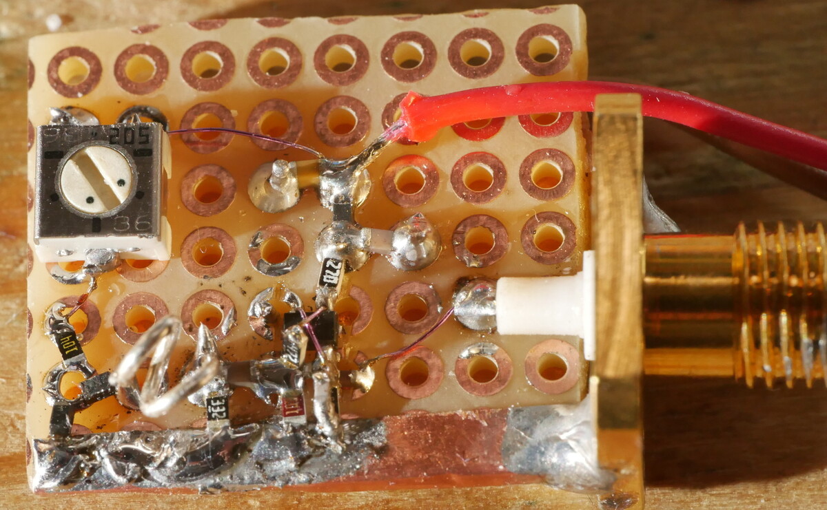 Die Lochrasterplatte kann man auch weglassen. Alles direkt auf die Massefläche bauen. Die Lötaugen erzeugen nur unnötige Kapazitäten. Im 3D Style auf Massefläche habe ich ATV Sender für 2,3 GHZ gebastelt. In den 90ern sogar mit bedrahteten Bauteilen. Kein Problem.