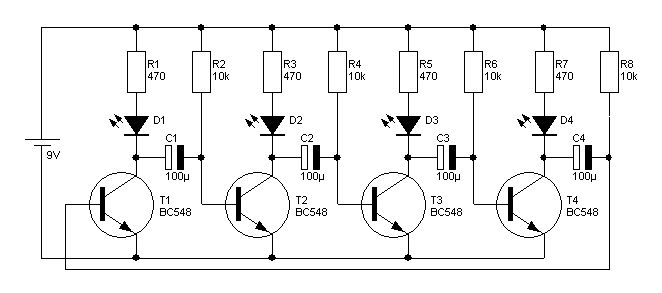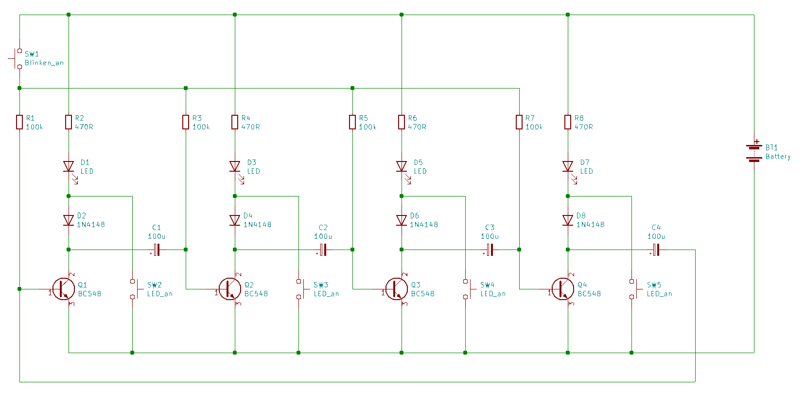 Vielen Dank für die Vorschläge. Ich bin jetzt selbst noch auf den Schaltplan aus einem Bausatz für Kinder gestoßen, leider mit Glühlampen statt LED, aber das sollte ja mit entsprechenden Widerständen kein Problem sein die zu tauschen. Den Schaltplan habe ich mal als Bild angehängt. Nun verwendet die Schaltung allerdings PNP Transistoren, ich habe aber nur NPN hier. Kann man das eventuell modifizieren? Außerdem würde ich gern auf das Poti verzichten und die Geschwindigkeit fest über die Elkos festlegen, geht das? Vielleicht noch eine kurze Erklärung, warum ich die Schaltung so aufbauen will und nicht mit ICs. Eventuell ergibt sich die Gelegenheit das Spielzeug irgendwann mit meinem Sohn auseinander zu nehmen und ihm die Funktion zu erklären. Selbstverständlich erst wenn er alt genug ist und eh nicht mehr damit spielt. Ich finde bei lediglich 4 LEDs ist das weniger kompliziert zu verstehen als mit ICs. Letztendlich könnte ich ihm im Anschluss zeigen, dass die ganzen Bauteile mittlerweile in einem Chip verbaut sind, ein IC ist ja im wesentlichen auch nur ein Haufen Kondensatoren, oder liege ich da falsch?