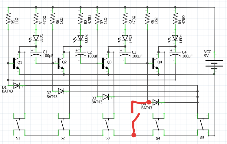 Stephan E. schrieb: > Das wollte ich ja genau andersherum. Ach soo, dann schalte die 4 Taster direkt von den Basen an GND. Wenn du nur einen Taster drückst, geht die entsprechende LED aus. Wenn du an die Stelle des roten Punktes einen Austaster einbaust, dann wird beim Betätigen der Elko vom davorliegenden Kollektor getrennt und alle LEDs bleiben an (spätestens wenn der Durchlauf beendet ist).