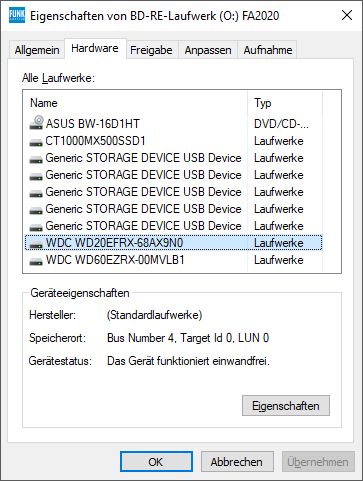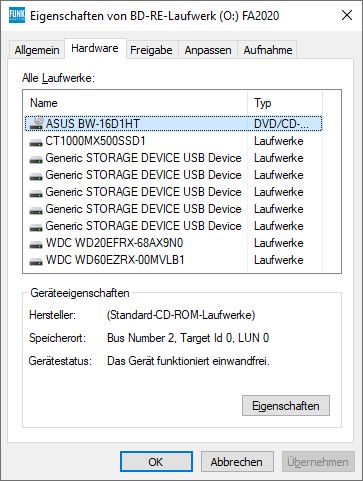 Moin, ich habe eine selbst gebrannte CD-ROM, die sich nicht mehr vollständig einlesen lässt. Die "hinteren" Bilder/Dateien werden nicht mehr geöffnet und das Laufwerk rödelt nur noch rum. Image ziehen mit CB-BurnerXP scheitert ebenfalls bei ca. 75% Also dachte ich, versuche ich es auf die ganz harte Tour mit dem C't-Tool h2cdimage. Mit Admin-Rechten aus der Kommanozeile gestartet findet es jedoch nicht das optische Laufwerk bzw. unter dessen Bus-Number nur eine der Festplatten (die laut Windows eigentlich unter der Bus-Number 4 läuft). Auch nicht mit einer intakten, gepressten CD. Das optische Laufwerk hat laut Windows folgende Eigenschaften: > Bus-Number: 2 > Target-ID: 0 > LUN: 0 Wenn ich h2cdimage mit diesen Parametern aufrufe, findet es jedoch nur die 2 TB WD-Festplatte. Spaßeshalber habe ich auch die IDs bis 33 durchprobiert, ohne Erfolg. Sytem: Windows 10 Home, 64Bit Laufwerk: ASUS BW-16D1HT/G 5,25 Zoll SATA Blu-ray-Brenner wnaspi32.dll Version 2.0.1.74 vom 2005-07-19 (war mit im heruntergeladenem Archiv) liegt im selben Verzeichnis Woran kanns liegen? MFG, Jens