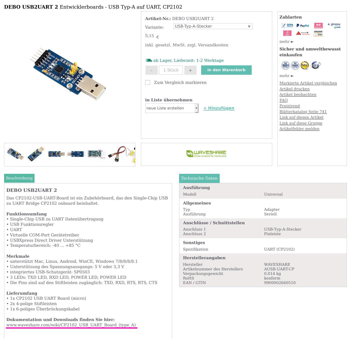 Hallo, nachdem der FT232RL nicht verfügbar ist habe ich mir den CP2102N als Alternative ausgesucht. (Leider ist der auch nicht gut verfügbar) Hat mir jemand eine Beispielschaltung so wie dieses kommerzielle Board von Reichelt mit 3V3 und 5V? https://www.reichelt.de/entwicklerboards-usb-typ-a-auf-uart-cp2102-debo-usb2uart-2-p266051.html?&nbc=1 Vielen Dank
