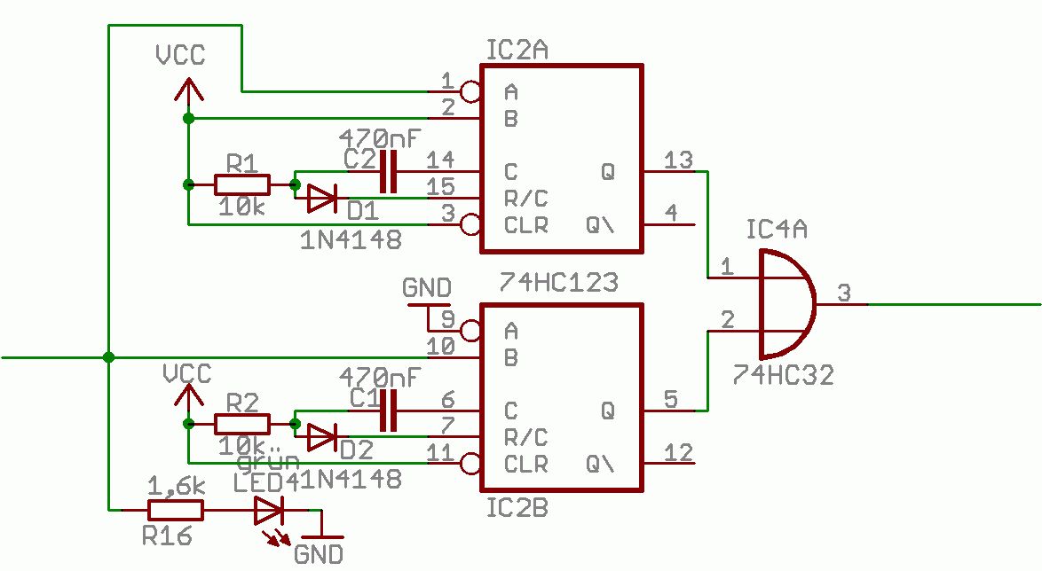 Ralf H. schrieb: > ich bräuchte Ab "Bisher..." in der Mitte des Textblocks habe ich dann nicht mehr verstanden, welchen Sinn die Worte geben sollen. Ralf H. schrieb: > Ist es mit besagter Schaltung möglich den Impuls zu verlängern? Warum soll jetzt ein Impuls "verlängert" werden? > Allerdings geht es hier um einen 0,5sek Impuls. Welchen "0,5s Puls" meinst du? Die verlinkte Schaltung gibt keine 0,5s Pulse aus. Bei weitem nicht... > Ist es mit besagter Schaltung möglich den Impuls zu verlängern? Wenn du damit fragst, ob die Schaltung auch längere Pulse ausgeben könnte: Ja, das kann sie. Lies das Datenblatt des 74HC123. Ich komme da z.B. auf 22µF und 330kOhm. Diese Schaltung besteht aus 2 flankengetriggerten Flipflops (eines auf die steigende Flanke und eines auf die fallende Flanke), deren Ausgang verodert ist. In deinem Fall musst du dem Relaiskontakt, der +5V durchschaltet, noch einen Pulldown geben, dass du bei offenem Relaiskontakt einen Low-Pegel bekommst. BTW: an der verlinkten Schaltung macht mich die Diode nachdenklich. die soll augenscheinlich aus dem retriggerbaren Monoflop ein nicht nachtriggerbares machen. In deinem Fall ist das unnötig, du kannst die Dioden weglassen.