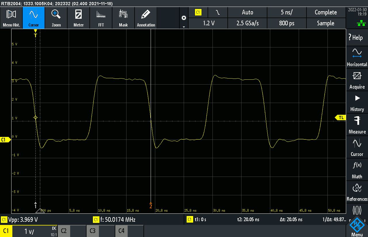 Das ergibt erstaunlich saubere 50Mhz am Ausgang. Es gibt sogar noch einen Trick mit dem man auf 100Mhz kommen muesste. (man kann den jmp befehl einsparen) Interessant ist aber das die Portausgaenge rattenschnell sind und diese Pegel richtig schoen ausgeben. So fuer Breadboard und etwas Draht rumtueddeln ist das nicht mehr der richtige Controller... Olaf