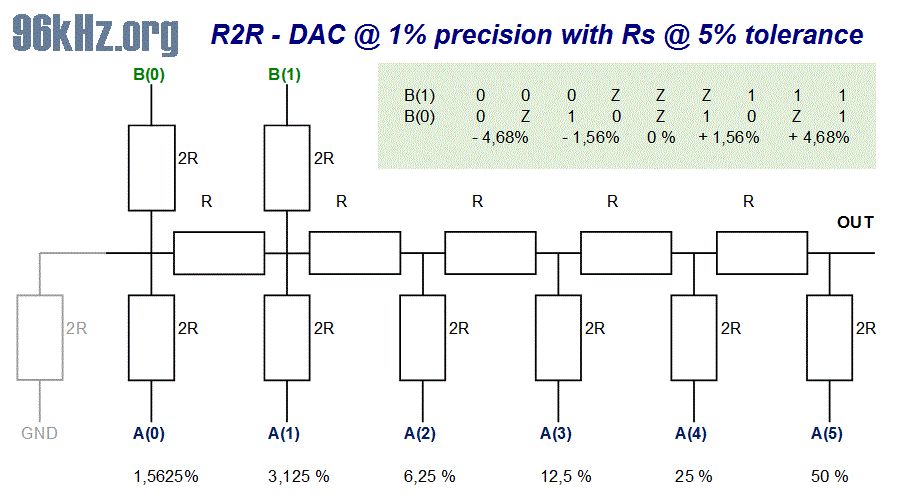 Moin, Mal mein Senf dazu: Vor zig Jahren habe ich mal ein bisschen mit R2R Netzwerken als "Billig-DAC" experimentiert. Das waren lauter gleichgrosse SMD Widerstaende, wo dann fuer den kleineren R immer 2 parallel geschaltet waren. IO-Ports kamen aus einem Spartan3 FPGA was ein DDS Signal generierte. Quintessenz war damals irrc: Mehr als 5 bit hat kaum mehr was gebracht. Drueber ist alles in Dreckeffekten verpufft... Gruss WK