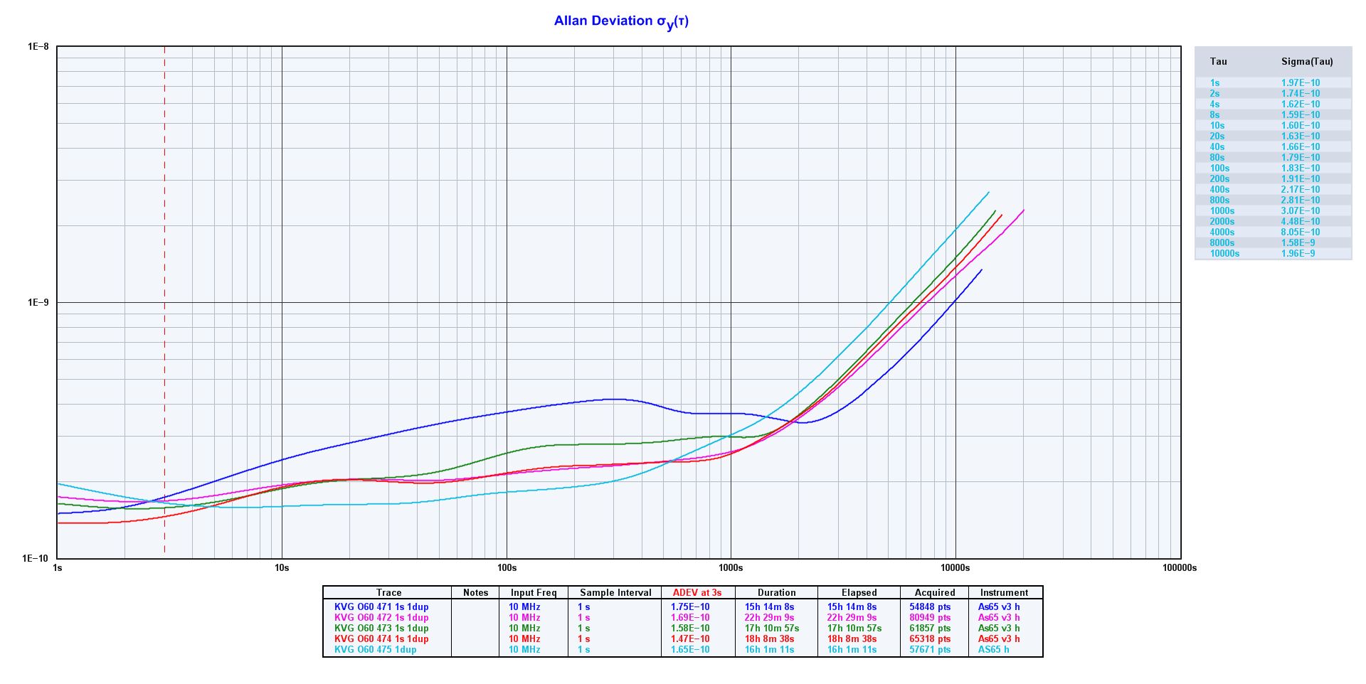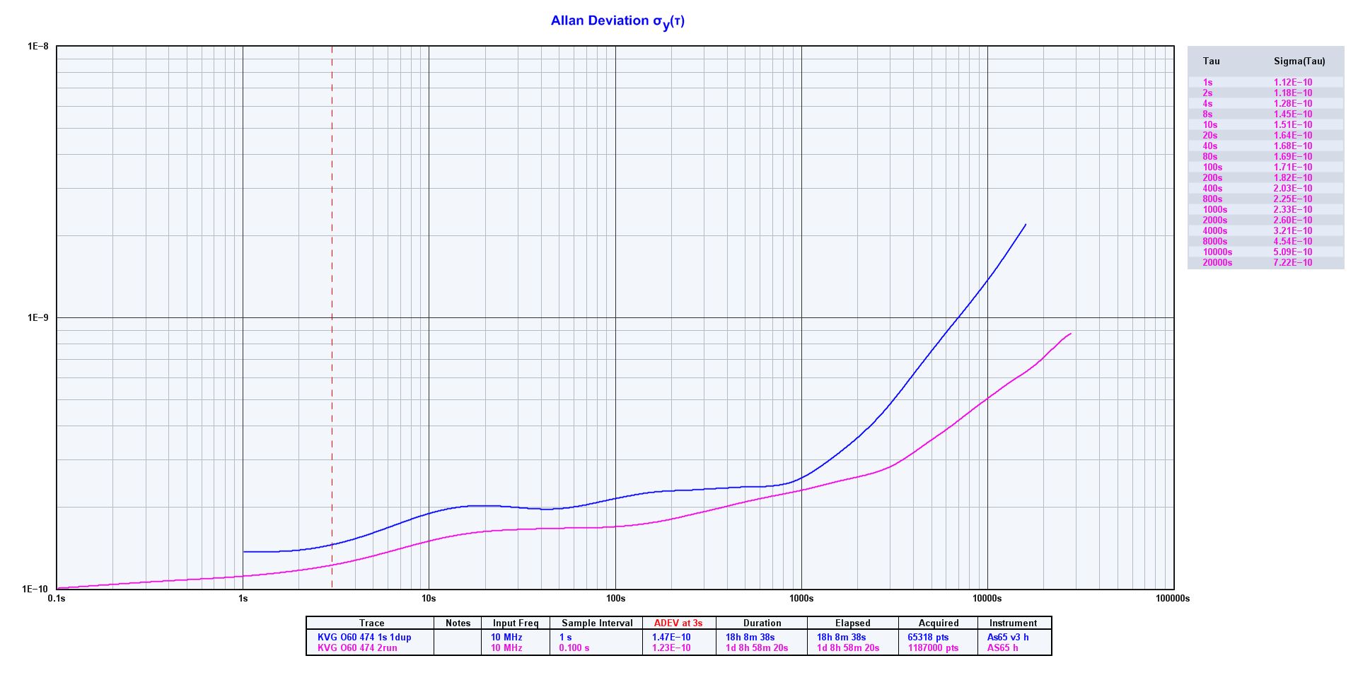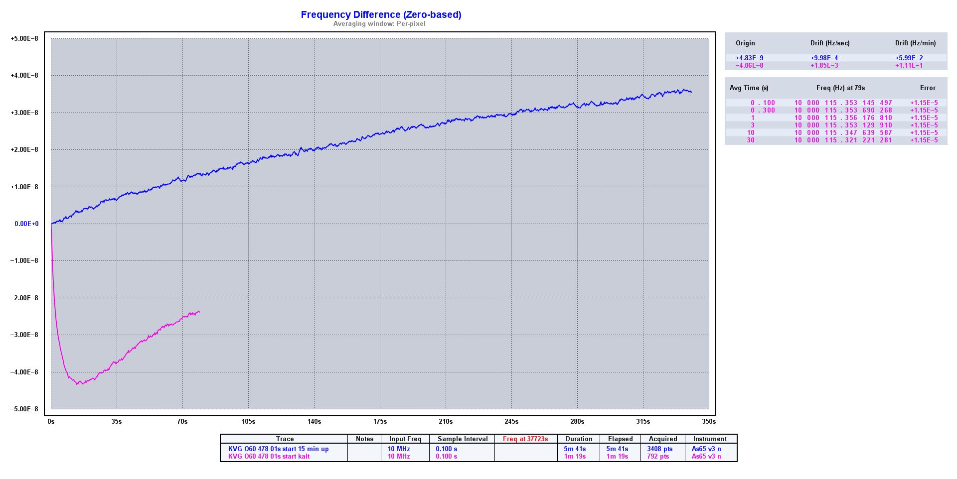 10MHZ OCXO KVG O.60.800504-LF Nach dem Frequenzverlauf beim anlaufen und dem großen Regelbereich wohl AT-Cut. Betriebsspannung 3.3V, Stromaufnahme 0,65A beim Start, 0,23A wenn warm. Frequenzregelbereich ca +100Hz bis -50Hz (wenn adjust Pad floating bzw Gnd). Das Pad was bei dem Gehäusetyp oft V-Ref ist, ist nicht verbunden. Die Verzinnung des Gehäuses ist teils angelaufen/weg? s. 2. Bild. Ich hatte sie als NOS gekauft, sie sind aber nicht das was ich brauche. Ich habe sie nur für die Tests 2-3 Tage laufen lassen. Nach einem Tag warmlaufen driften sie immer noch, die Messung mit 0.1s Meßzeit am Tag danach war besser (s. vorletztes Bild). Einen hatte ich gut eine Woche laufen, dann gab es Nachts einen Stromausfall, dann wieder einen Tag warmlaufen. Auch hier ist die Messung besser (letztes Bild) als einen Tag nach dem "auspacken". 15€/St plus Versand nach Wahl. Kontakt bitte per PN mit Emailadresse.