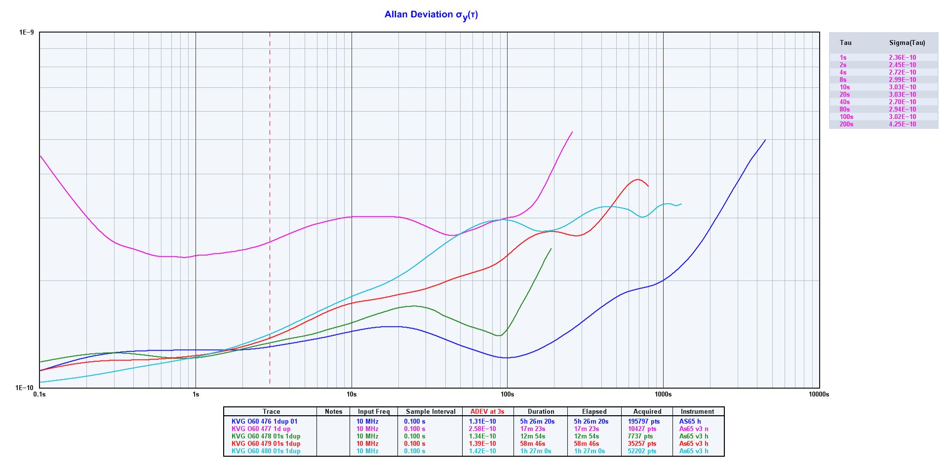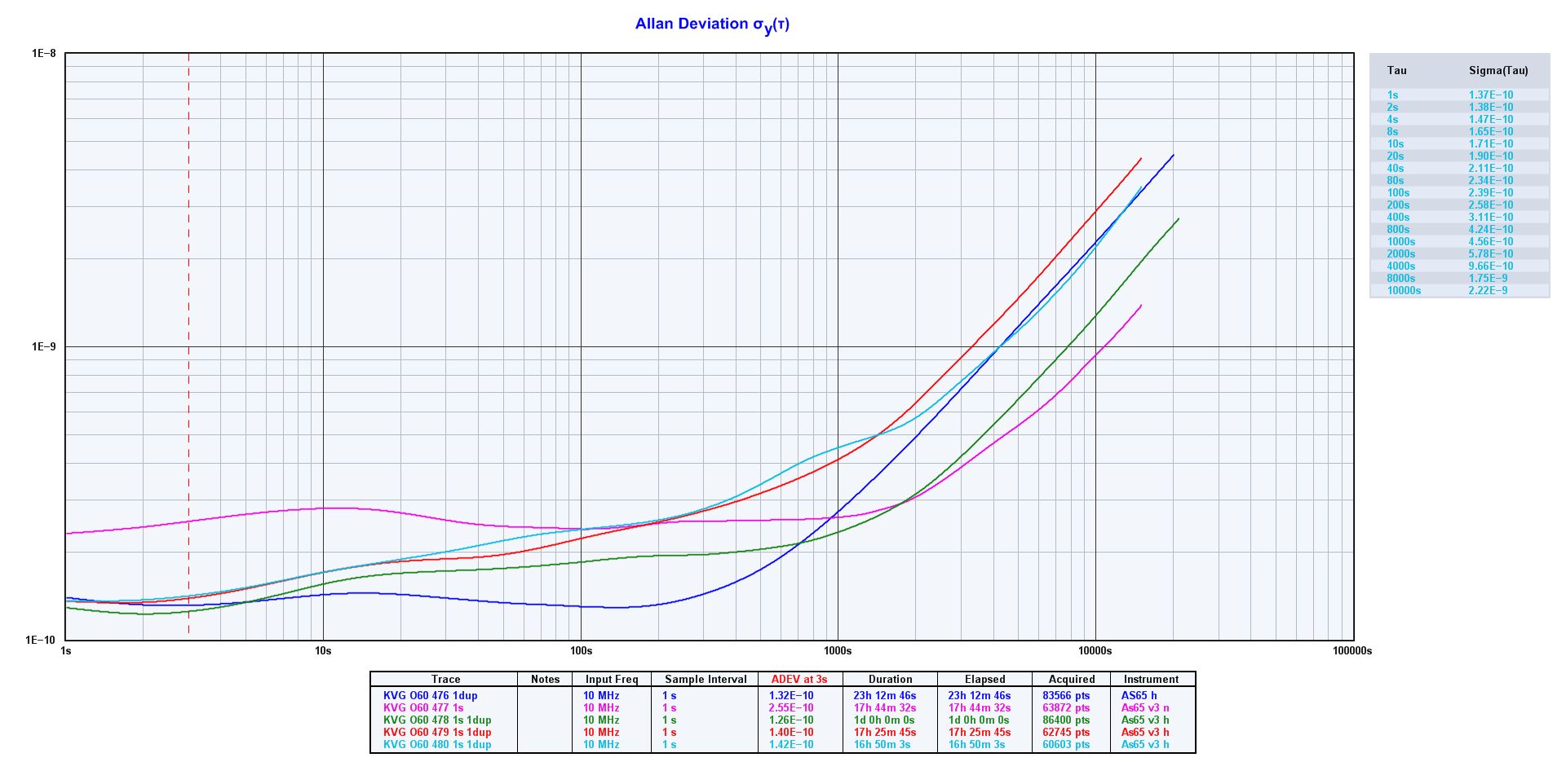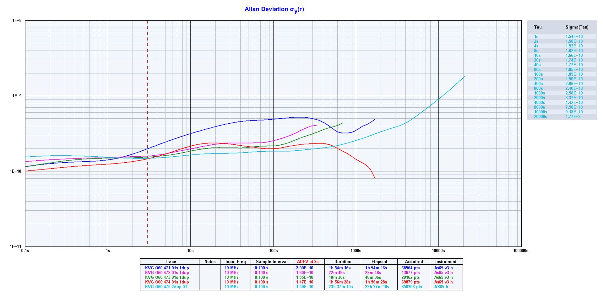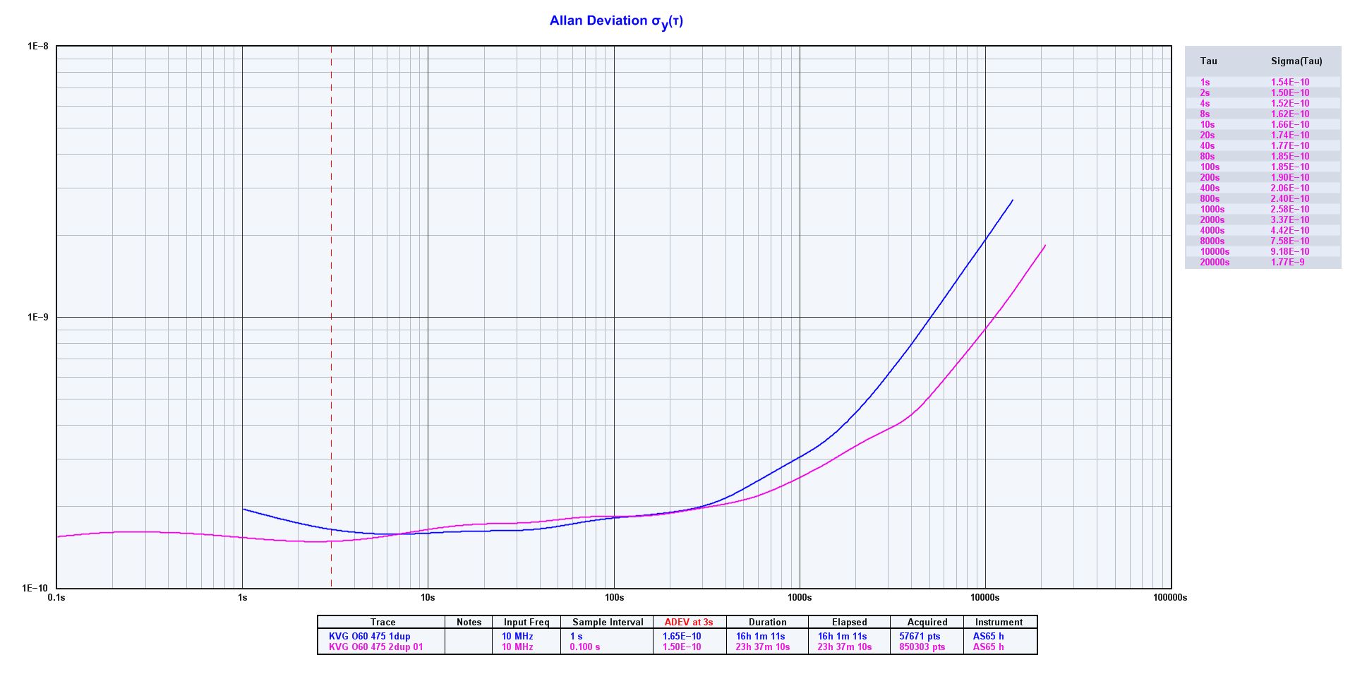10MHZ OCXO KVG O.60.800504-LF Nach dem Frequenzverlauf beim anlaufen und dem großen Regelbereich wohl AT-Cut. Betriebsspannung 3.3V, Stromaufnahme 0,65A beim Start, 0,23A wenn warm. Frequenzregelbereich ca +100Hz bis -50Hz (wenn adjust Pad floating bzw Gnd). Das Pad was bei dem Gehäusetyp oft V-Ref ist, ist nicht verbunden. Die Verzinnung des Gehäuses ist teils angelaufen/weg? s. 2. Bild. Ich hatte sie als NOS gekauft, sie sind aber nicht das was ich brauche. Ich habe sie nur für die Tests 2-3 Tage laufen lassen. Nach einem Tag warmlaufen driften sie immer noch, die Messung mit 0.1s Meßzeit am Tag danach war besser (s. vorletztes Bild). Einen hatte ich gut eine Woche laufen, dann gab es Nachts einen Stromausfall, dann wieder einen Tag warmlaufen. Auch hier ist die Messung besser (letztes Bild) als einen Tag nach dem "auspacken". 15€/St plus Versand nach Wahl. Kontakt bitte per PN mit Emailadresse.