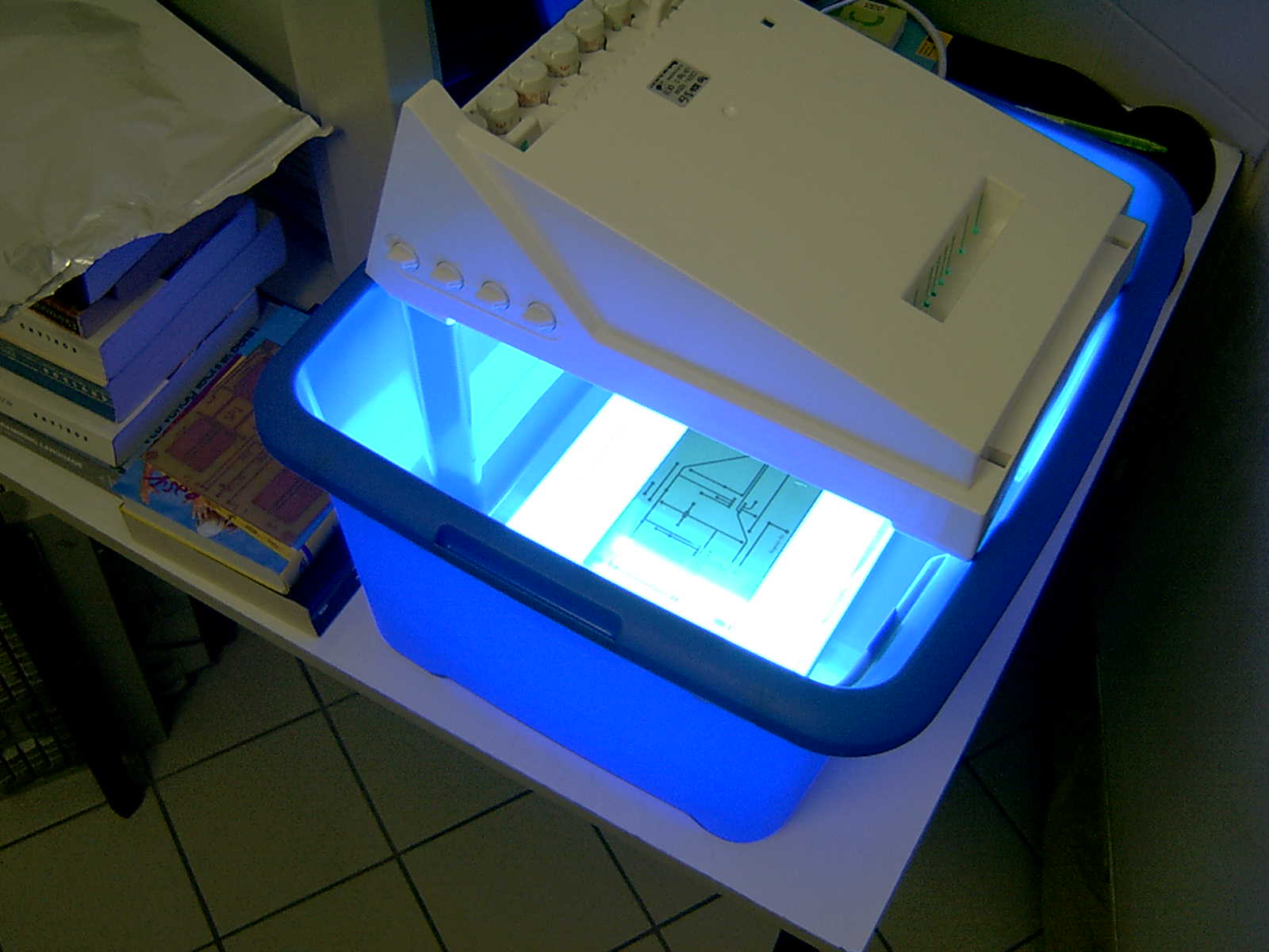 Hallo Ludwig, ich habe einen Kosmetikbräuner für 7 auf dem Flohmarkt erstanden (Neupreis angeblich 130). Außerdem eine Plastikbox im Supermarkt für 2,49. Mit 3min Vorwärmzeit und 5min Belichtungszeit - durch eine dünne Glasplatte zum Anpressen der Overheadfolie auf die Photoschicht - gelang es mir, gute Platinen herzustellen. Thomas