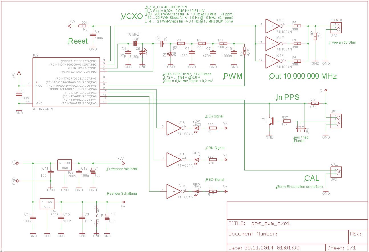 Hallo Patrick L. (Firma: S-C-I DATA GbR) (pali64), ich befürchte, dass du dir kluge Gedanken machst, die an Sinn und Funktion meiner Schaltung vorbei gehen. Sie erfasst, ob der VCXO per PWM auf 10.000.000 +/- 1 Pulsen zwischen 2 pps-Pulsen abstimmbar ist. Gelingt es, verlässlich hintereinander eine Taktrate von 10.000.000 +/- 1 zwischen 2 pps-Pulsen zu messen, wird "grünes Licht" gegeben. Der 10 MHz-Ausgang liefert offensichtlich 10 MHz +/-0,1 ppm. Funktioniert das nicht, wird keine Fehler-Ursache vermutet, sondern nur signalisiert, dass die 10 MHz nicht auf 0,1 ppm genau sein können.