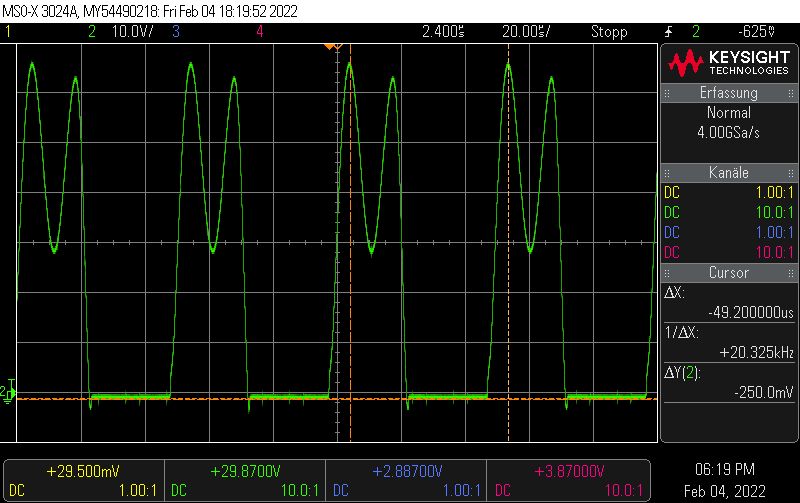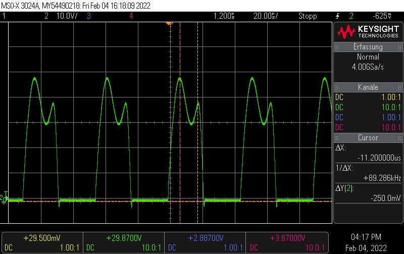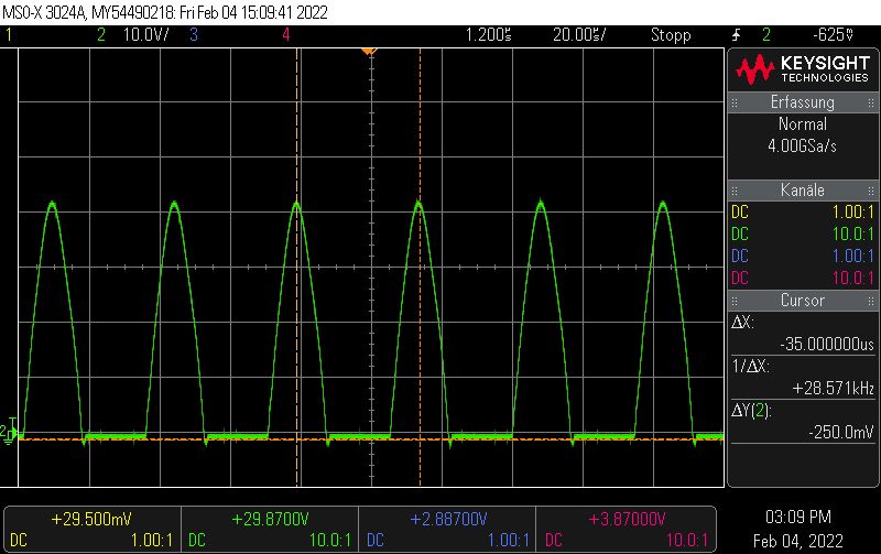 Ohne Kenntnis der induktiven Bauteil-Parameter? Was soll das? Kurz gesagt braucht man szsg. "Datenblätter" oder zumindest "Datenblatt-Werte" - wofür es keines gibt, wie für den Trafo selbst (Selbstbau nehme ich an), ein provisorisches solches selbst_zusammenstellen (Kerntyp, genauer Wicklungsaufbau, Windungszahlen...), und auch bzgl. Drossel jibbet mehr als "680µH" (auch wenn L auf den ersten Blick nicht recht hoch erscheint für unter 100kHz, könnte sie je nach Strom passen). SO kann man hier nicht effektiv mit einer Analyse beginnen. Wie sieht allgemein der Aufbau aus? (Beschreibung/Fotos)? Und was ist "die Last" an [HSP-], außer dem Vervielfacher? Bis das alles sauber aufgeführt/geliefert wird, kann man nur herumraten - die Signalform allein zeigt nicht "das Problem".