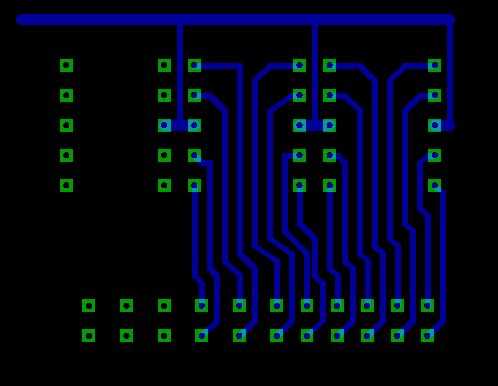 Hallo, ich habe 4 7-Segment-Anzeigen aneinandergeklebt und wollte diese auf eine kleine Platine löten um das ganze dann über eine Wannenbüchse und Flachbandkabel mit einer anderen Platine zu verbinden. Habe jetzt schon zig mal das Routing geändert ich komme aber auf keinen kompakten Zweig. Hat jemand nen kleinen Vorschlag für mich wollte das möglichst einseitig machen und das ganze mit 4 Latches betreiben deswegen habe ich auch die Masseanschluße 3 und 8 von jedem Segmant zusammengefasst so bräuchte ich nur einen einzigen Masseanschluß und jeweils 7 Datenleitungen zu jedem Segment.