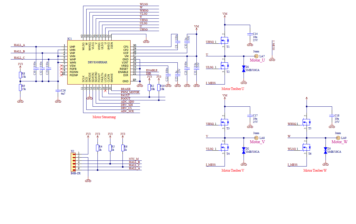 Wenn ich mich für ein IC zur Ansteuerung eines BLDC Motors interessiere, schaue ich doch erstmal nach, ob es sich für meinen Motor eignet. Ein Blick ins Datenblatt des DRV8308 enthüllt folgendes: 8.2.1 Design Requirements Motor current (peak and RMS) IM 10A peak, 3A RMS Wenn mein Motor 100A zieht, sollte mehrfaches Stutzen angesagt sein. Es gibt auch ein evaluation board mit dem DRV8308. Dort sind 3 Dual-MOSFETS enthalten: https://www.ti.com/lit/gpn/csd88537nd Mit Qg=14nC @10V und Ciss=1080pF passt das auch zum Treiber.
