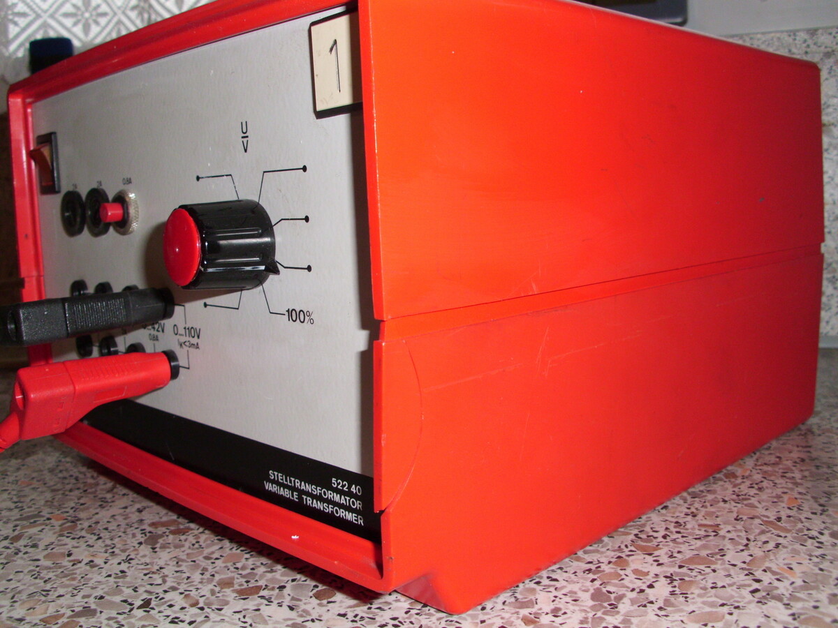 Wegen Hobbyauflösung gegen Portoersatz 8,49€ abzugeben: Stelltrafo Leybold 52240 Alle Spannungsbereiche funktionieren. Gehäuseecke gebrochen, siehe Bild. Bitte Anfragen per PN mit Emailadresse. Gruß Peter