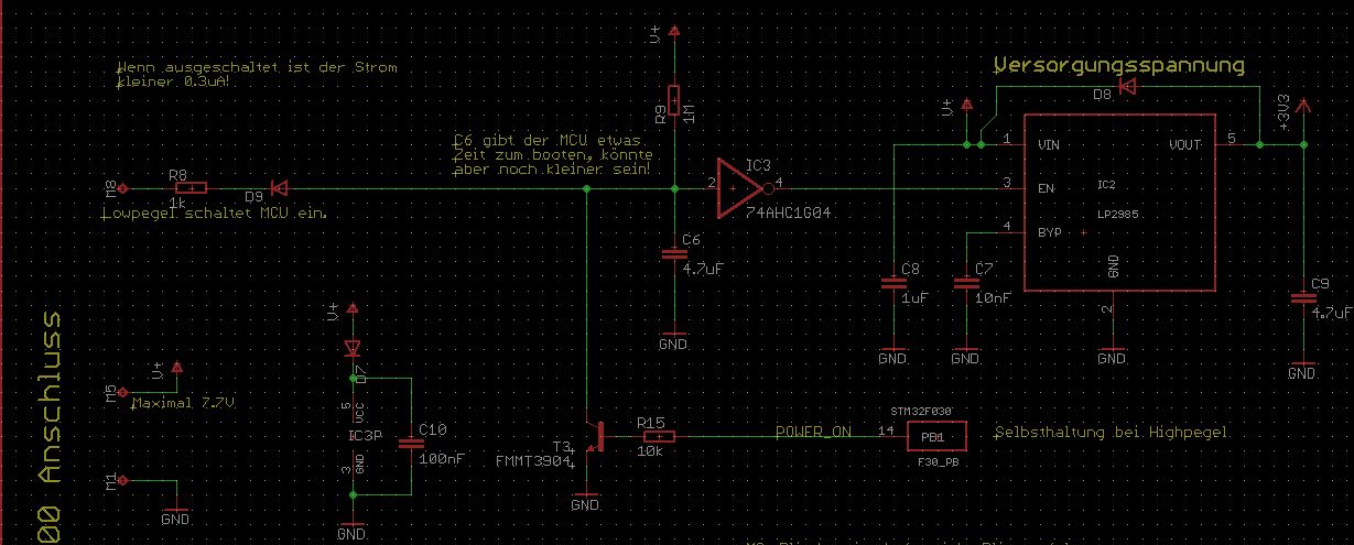 In einem Arduino-Projekt nutze ich einen ESP32 als "Kernelement" für einen mp3-Player. Der Player wird entweder per USB oder per Akku (LiPo / FePo) betrieben. Es gibt einen Laderegler, der den Akku (sofern notwendig) lädt, wenn eine USB-Versorgung vorhanden ist. Ein/ausgeschaltet wird der ESP32 bisher per Taster. Wobei Ausschalten bisher Deepsleep bedeutete und ich habe dann einen Mosfet benutzt, um die Peripherie (SD, DAC, Amp, Neopixel...) spannungslos zu schalten. Auch wenn der Deepsleep-Verbrauch für einen uC in diesem Setting vergleichsweise hoch war, hat das Ganze, gemessen am geringen Aufwand, sein Ziel erstmal erreicht. Auch wenn es in diesem Projekt nicht auf das letzte uA im ausgeschalteten Zustand ankommt, habe ich mir zum Ziel gesetzt, diesmal etwas weiter "vorne" anzusetzen und über den Enable-Pin des LDOs (ggf. wird's auch ein STBB1-APUR) den ESP32 und die ganze dahinterliegende Peripherie spannungslos zu schalten. Zu dem, wie ich mir das so überlegt habe, habe ich mal ausschnittsweise einen Schaltplan angehängt. Anforderungen: * Wenn der Player nicht gebraucht wird, soll der LDO deaktiviert sein, so dass ESP32 + Peripherie nicht versorgt werden. * Ich möchte den Player über einen kurzen Tasterdruck einschalten können. * Im laufenden Betrieb soll es eine Selbsthaltung geben, die der ESP32 via GPIO steuert. * Über einen Dip-Switch möchte ich den LDO wahlweise auch dauerhaft aktivieren können (Bypass). * Push-Button-ICs sind zuweilen nicht ganz günstig oder aktuell schwer zu kriegen. Ich würde es daher gerne mit recht einfachen Mitteln versuchen, auch wenn das verbrauchstechnisch ggf. etwas nachteilig ist. Auch möchte ich keinen zweiten uC einsetzen. Zur Erklärung: * VIN ist die Spannung, die entweder von USB oder vom Akku kommt. D.h. maximal haben wir hier 5 V, es könnten jedoch auch nur etwa 3 V ankommen. * POWER führt zu einem GPIO des ESP32. Recht früh in der Setup()-Routine wird hier LOW draufgeschaltet (Selbsthaltung). Über einen anderweitigen Tastendruck wird der ESP32 in den Deepsleep überführt - die Selbsthaltung endet damit. * Button_PPlay ist ein Taster, dessen Tasteraktionen von einem Port-Expander registriert werden (nicht im Bild) und entsprechend Aktionen auslöst. Der Taster hängt an GND, d.h. beim Drücken des Tasters kommt in der gezeigten Schaltung GND an. * EN_APUR ist der Enable-Pin des LDOs. Problem: Button_PPlay wird im Normalfall nur kurz gedrückt. Jedenfalls zu kurz, als dass der ESP32 schon in Selbsthaltung gehen könnte. Diese Zeit möchte ich überbrücken (und dachte da an ein RC-Glied). Meine Ideen (siehe Schaltplan): * Drückt man die Button_Pplay, so werden über Q1 die beiden Kondensatoren C11 und C12 schnell aufgeladen. * Lässt man Button_Pplay wieder los, so sperrt Q1 wieder und die beiden Kondensatoren steuern das Gate von Q4 an. Gleichzeitig werden sie über R20 entladen. * Mit insgesamt 14,7 uF zu 100 k habe ich eine Entladedauer von 7,35s berechnet (5 Tau). Q4 hat jedoch eine Vgs von 0,9 V, so dass ich eher mal mit 2 Tau gerechnet habe: 3 V * 0,63 * 0,63 = 1,19 V. Grob müsste das etwa für 3 s Stützzeit reichen. * R20 dient als Pulldown-Widerstand für Q4 und den LDO. Gleichzeitig jedoch auch als Entladewiderstand von C11/C12. * R19 dient zum Begrenzen des Stromes vom GPIO. Nicht zuletzt auch im Hinblick darauf, dass es keinen Kurzschluss geben kann, wenn man ESP32-seitig hier HIGH draufschaltet. * D5 müsste keine Schottky sein. Generell möchte ich mit der Diode (richtig rum gesetzt?) verhindern, dass ein LOW via Q4 oder POWER Rückwirkungen in Richtung Button_PPlay auf den Port-Expander hat, so dass hier falsche Tastenereignisse erkannt werden. Frage: Kann das so funktionieren oder habe
