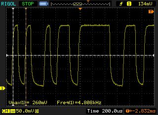 Falk B. schrieb: > Ja, das könnte man in einem 2 Schritt anpassen und testen. So sieht es zwischen zwei Flanken aus. Von High nach Low sieht es etwas verzögert aus, die ansteigende Flanke finde ich noch i.O. Wenn es keine anderen Ideen gibt, würde ich jetzt wie folgt vorgehen: 1) Den 300k Widerstand (ich nenne ihn jetzt R5) würde ich mit einem 2. 300k auf 150k einstellen. Danach messe ich wieder am Kollektor von T3 (einmal die Flanken [10µs Auflösung] und einmal paar Bits [200µs Auflösung]). 2) R1 auf 6,5K absenken (zweiter 13k drüber). Damm wieder 2 Messungen durchführen. 3) ggf. erneut R5 anpassen (weiter Absenken, damit Ube steigt) und erneut 2 Messungen durchführen.