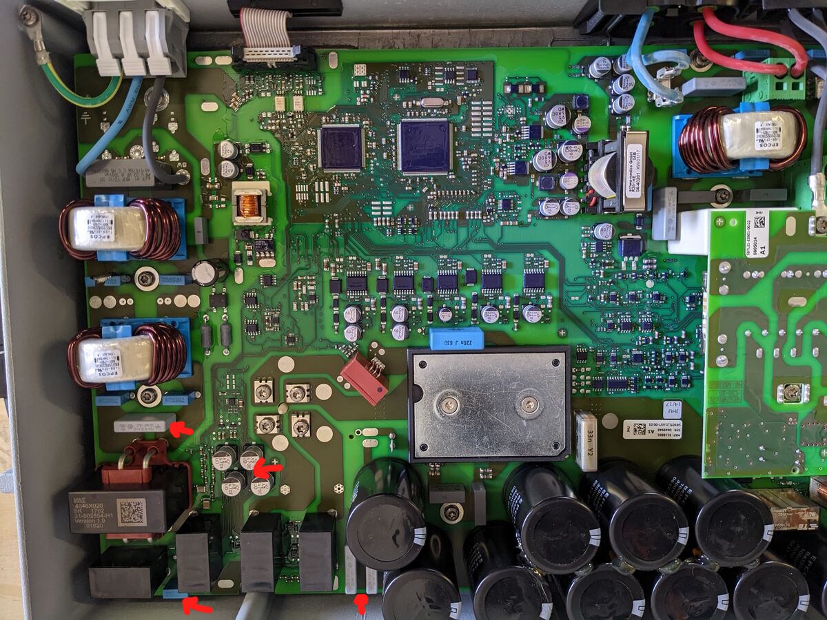 Zum prüfen habe ich immer meine Solaranlage 2,5kW /420V MPP angeschlossen. Auf dem Bild hatte ich sie wieder abgeklemmt. Die alten Relais waren alle in Ordnung, deshalb hatte ich mit dem Einlöten der neuen Relais wenig Hoffnung auf Änderung. Auch sonst ist nichts auffälliges zu sehen oder zu riechen. Der Entstör MKP hat keinen Schaden angerichtet.