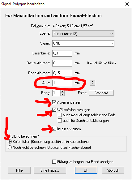 Hallo zusammen, ich oute mich mal als zufriedener Target-Nutzer. Momentan habe ich gerade ein Layout, das ein THT/SMD-Mix ist. Dabei sind die THTs alle auf einer Seite zu verlöten und auf derselben Seite ist auch das GND-Layer. Als Aura habe ich aktuell 0,3 mm. Damit komme ich auch zurecht. Ich würde aber gerne auf 0,6 hochgehen, aber nur auf dem GND-Layer. Sinn: Dann können auch weniger Geübte die THT-Sachen verlöten ohne Kurzschlüsse nach GND zu fabrizieren. Auf dem anderen Layer reichen 0,3 mm. Da lötet ja keiner. Kurz: Ich möchte beim Füllen der Massefläche einstellen können, dass der Abstand zu Pads nicht die Aura des Pads sein soll, sondern ein anderer Wert (0,6 mm). Bin ich blind oder gibt's die Möglichkeit nicht?